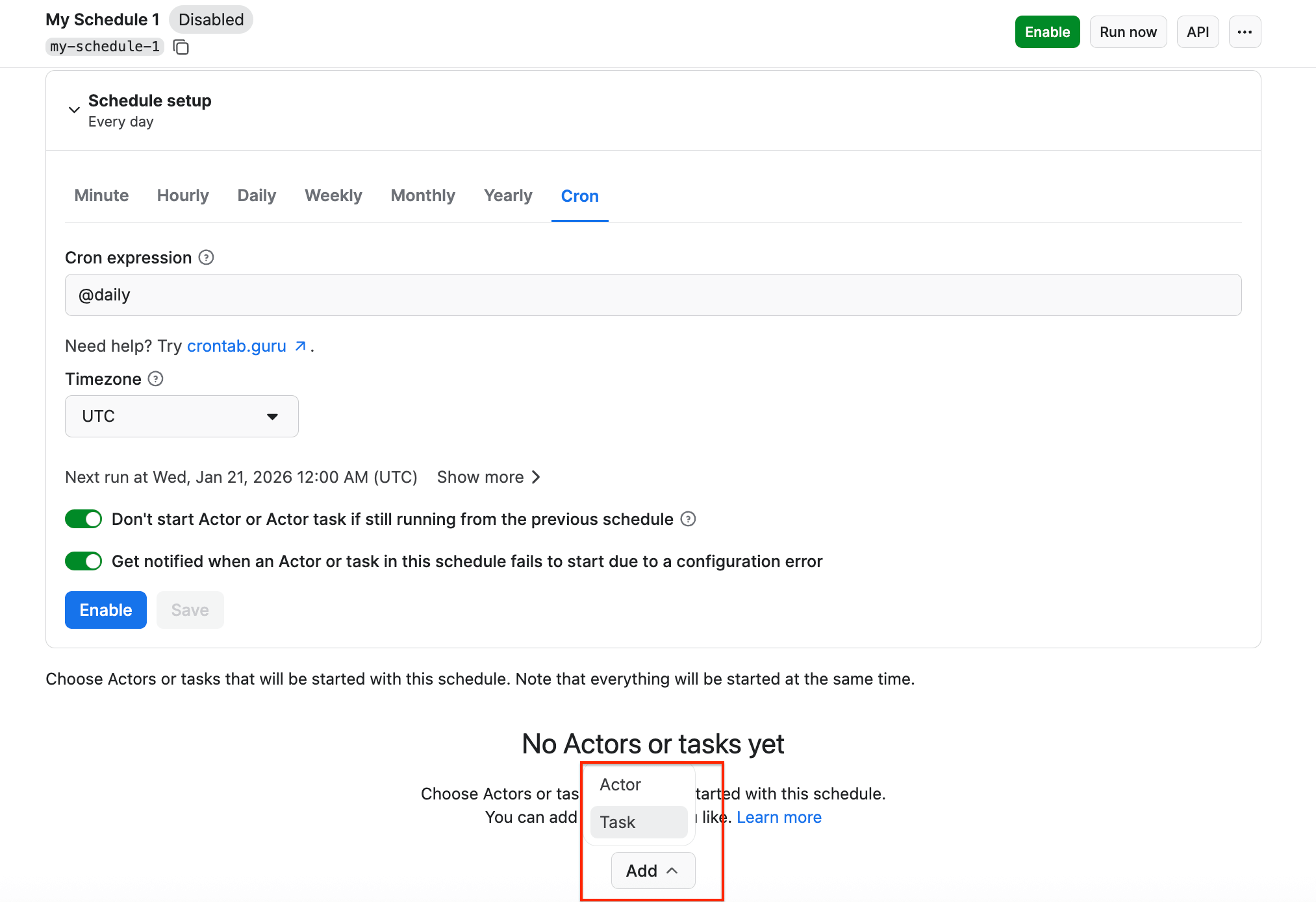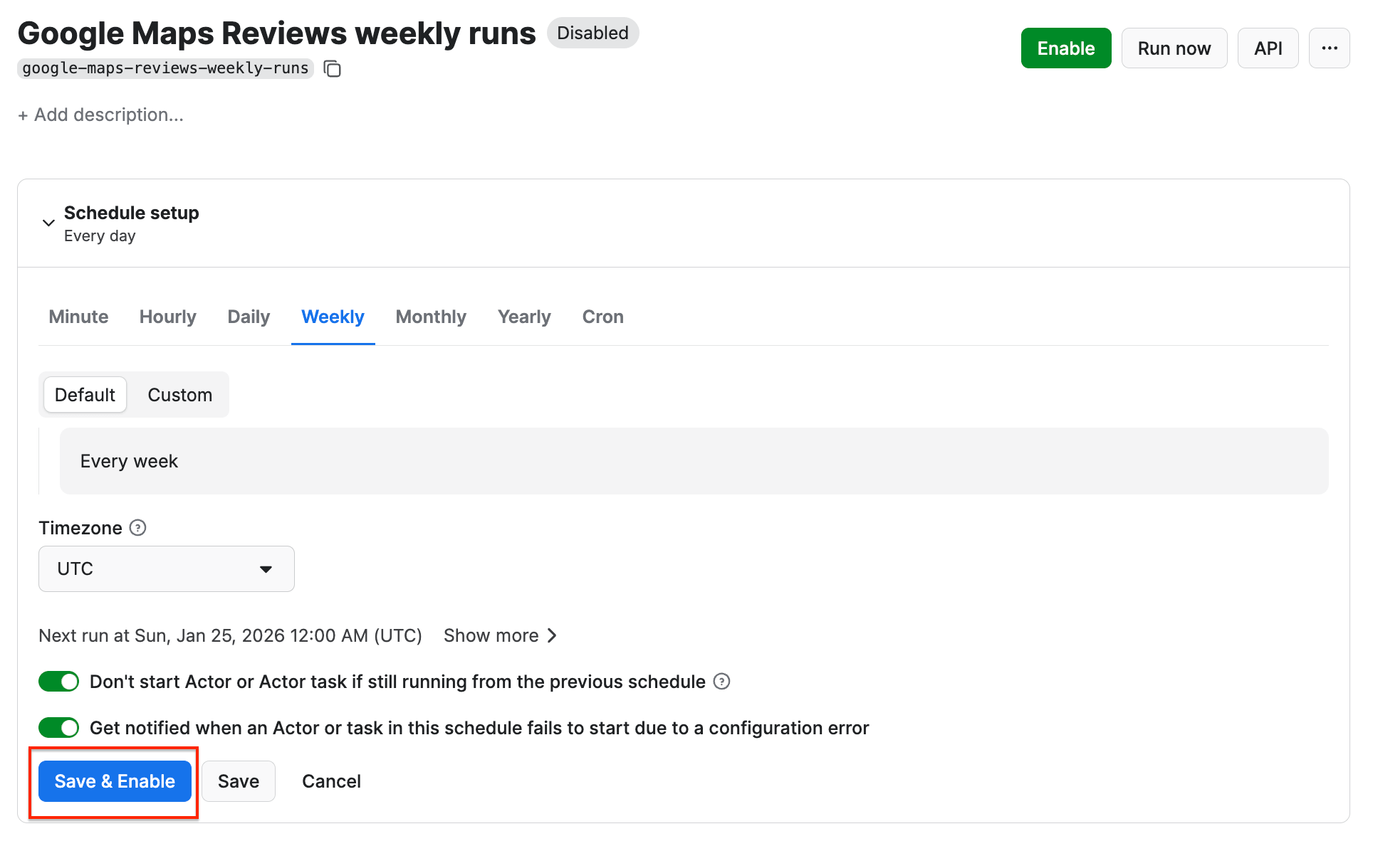 Click Save & Enable, and your schedule will be up and running. It will automatically start the scraper at your chosen time and send the results to Google Drive, thanks to the integration we set up earlier.