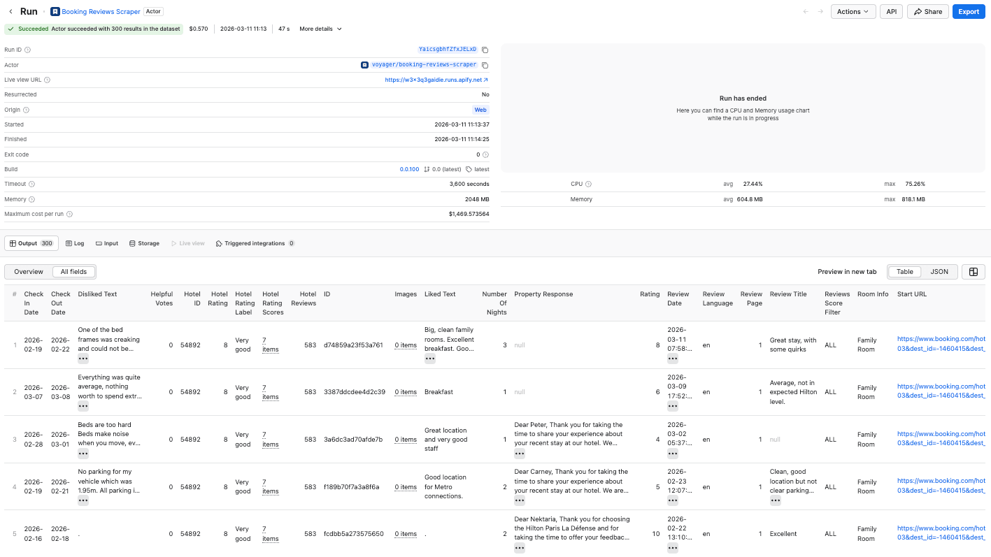 Booking Reviews Scraper can extract reviews from hotels, apartments, and other accommodations listed on the Booking.com portal. It fetches review text, ratings, stars, basic reviewer info, length of stay, liked/disliked parts, room info, date of stay, and more.
