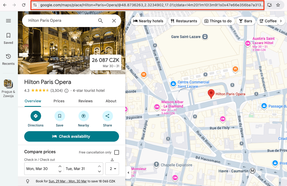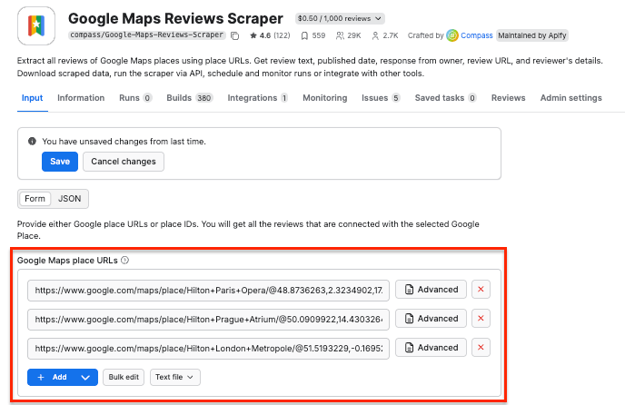 In our case, we’ll use the URLs of the same three Hilton hotels - in Paris, London, and Prague. To do that, find the places on Google Maps, copy the URLs, and paste them in the Google Maps place URLs field.