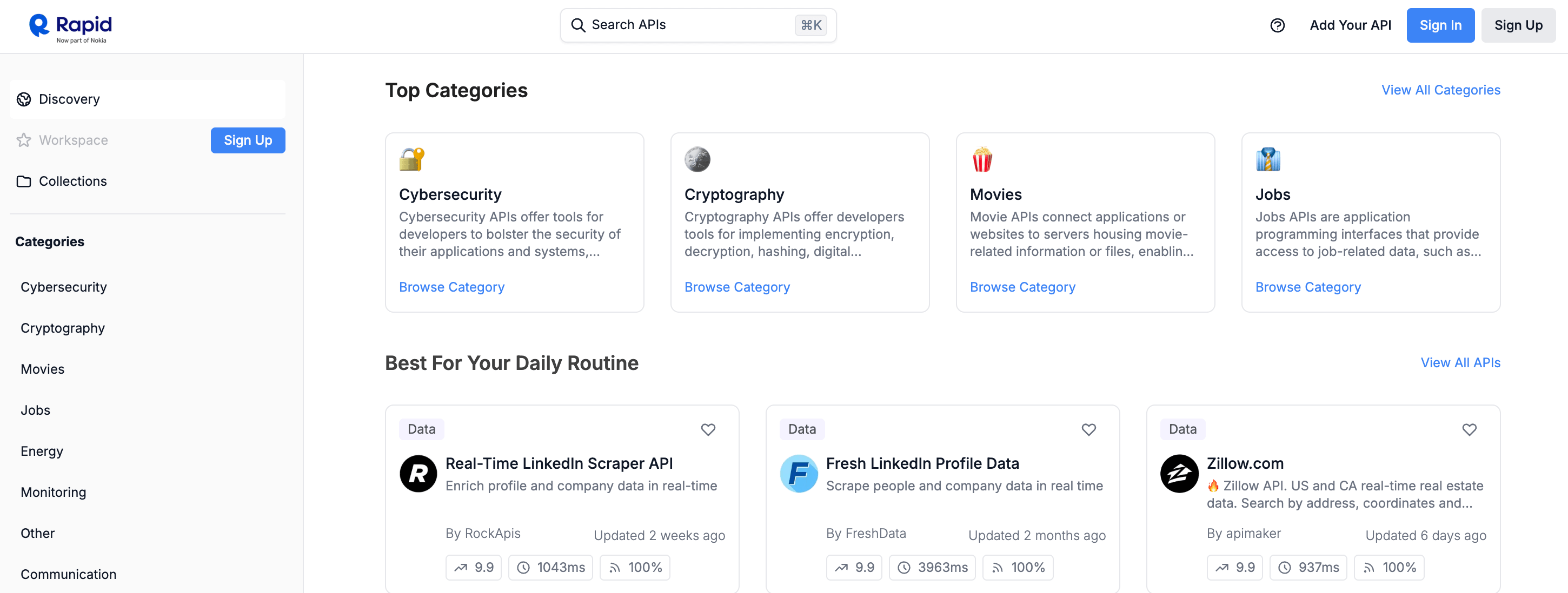 RapidAPI is one of the largest API hubs on the web, providing a unified platform for publishing, managing, and monetizing APIs. When you list an API on RapidAPI, the marketplace handles subscription management, rate limiting, analytics, and billing, so providers don’t need to build their own commercial infrastructure. Developers can browse thousands of APIs, test endpoints instantly, and subscribe through a single dashboard with centralized billing.