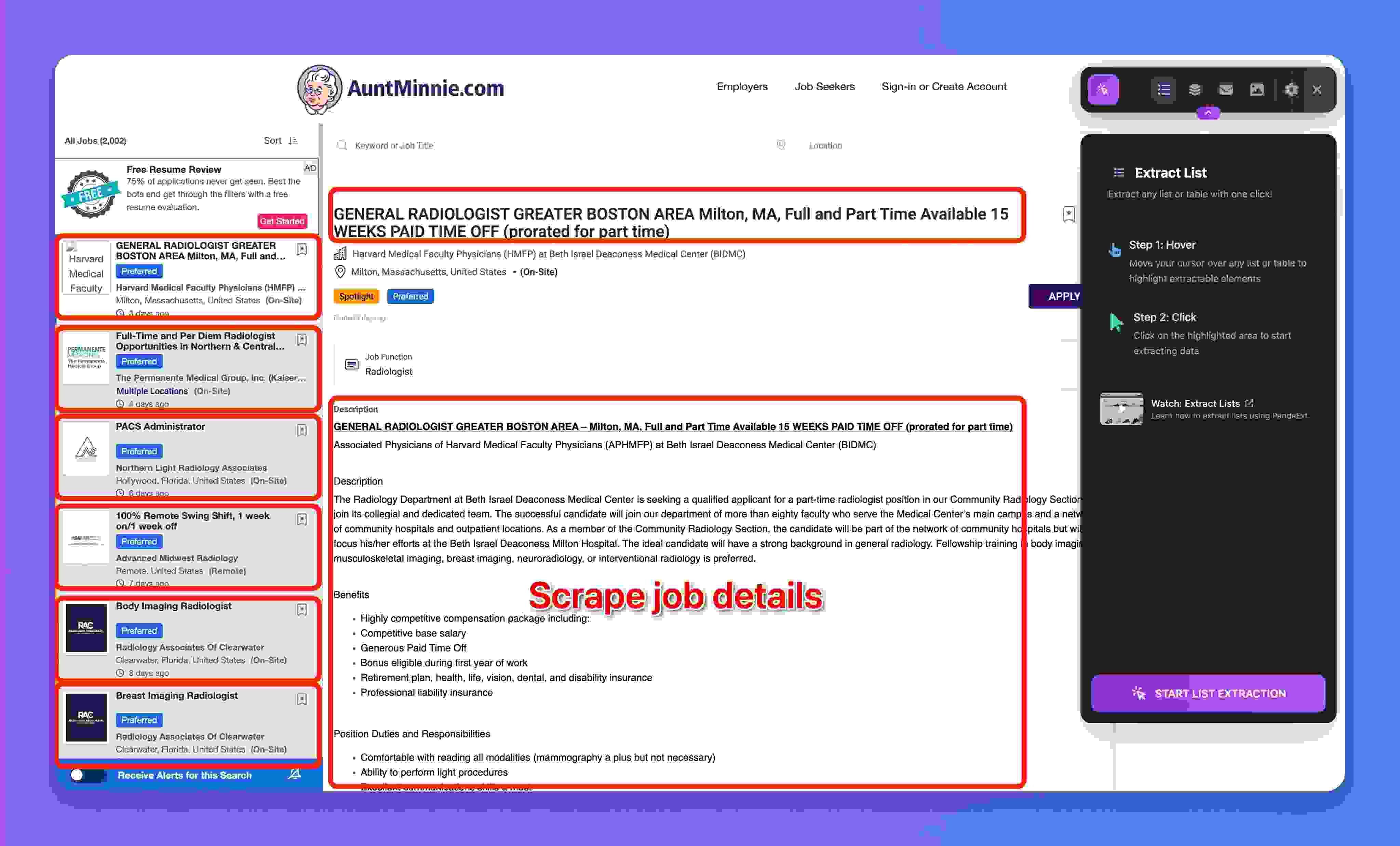 - Pre-configured extraction for typical job fields: description, salary, company info, etc.