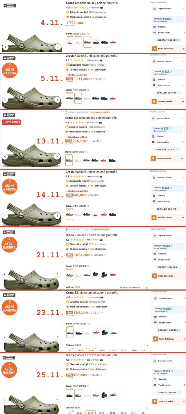A clear example comes from Trendyol. When tracking the price - and especially the strikethrough price - of these Crocs throughout November, it becomes evident that the discount is not calculated from the minimum price before the promotion. Instead, the pattern suggests an effort to maintain a consistent percentage discount, regardless of how the price changes.