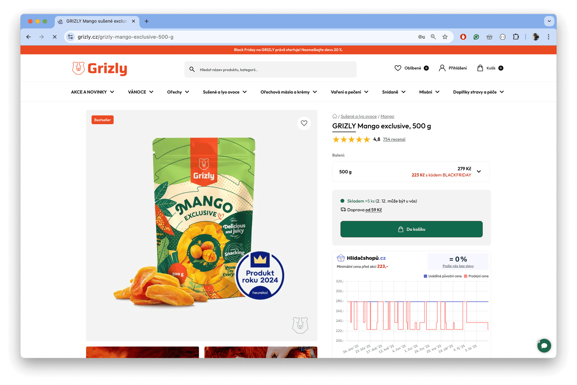 This year, we also added the successful Grizly e-shop to our monitoring. Their discounting practices can be demonstrated with their “Product of the Year 2024 according to Heureka” example: Grizly Mango Exclusive, 500 g. It was sold with the BLACKFRIDAY code for CZK 223, with a reference price listed as CZK 279.