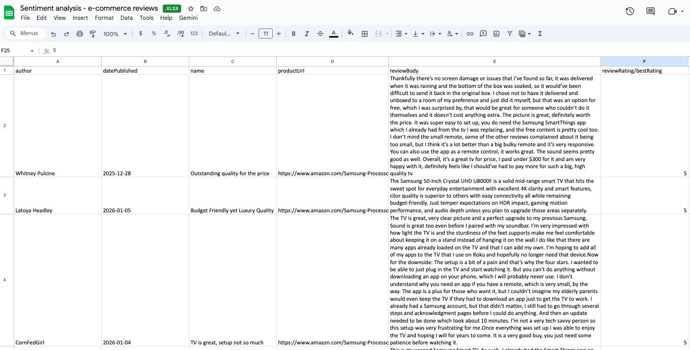 Building your own sentiment monitoring pipeline solves these problems. In this tutorial, we’ll show you how to create a repeatable workflow that collects and analyzes customer reviews from multiple e-commerce sites. With Apify’s E-commerce Scraping Tool, you’ll extract reviews in a structured format on a schedule and send the data directly into Google Sheets. From there, you can use AI to analyze sentiment on your own terms.