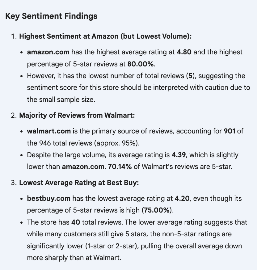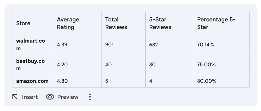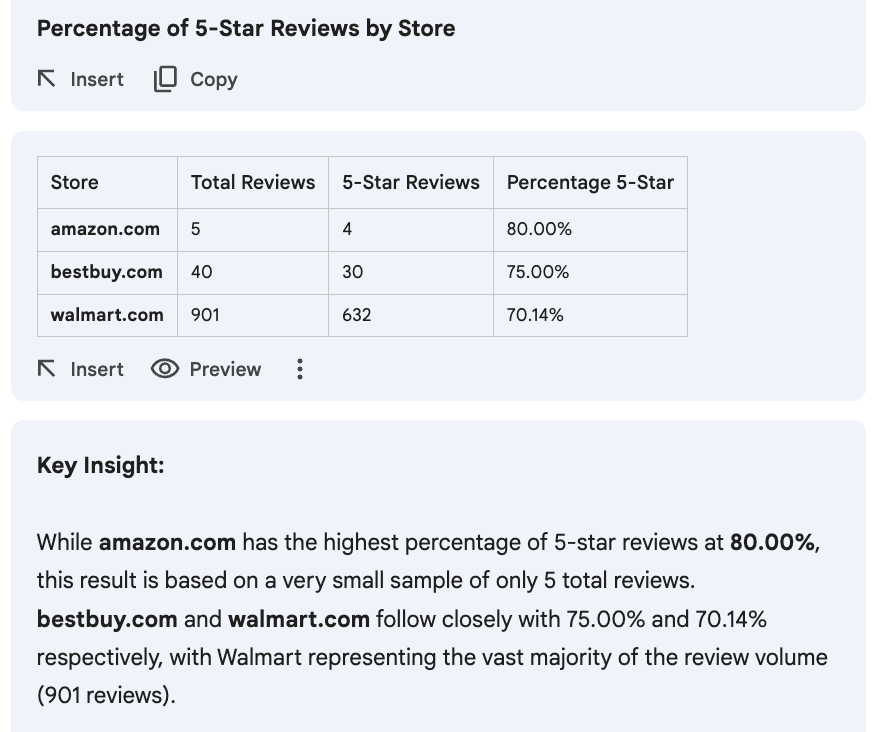 Now you can interact with Gemini inside your spreadsheet and get a detailed analysis, including charts, average ratings, and more. Here’s what we got with the Perform sentiment analysis and break down the results by store. You can identify the source store based on the URL in the productUrl column prompt: