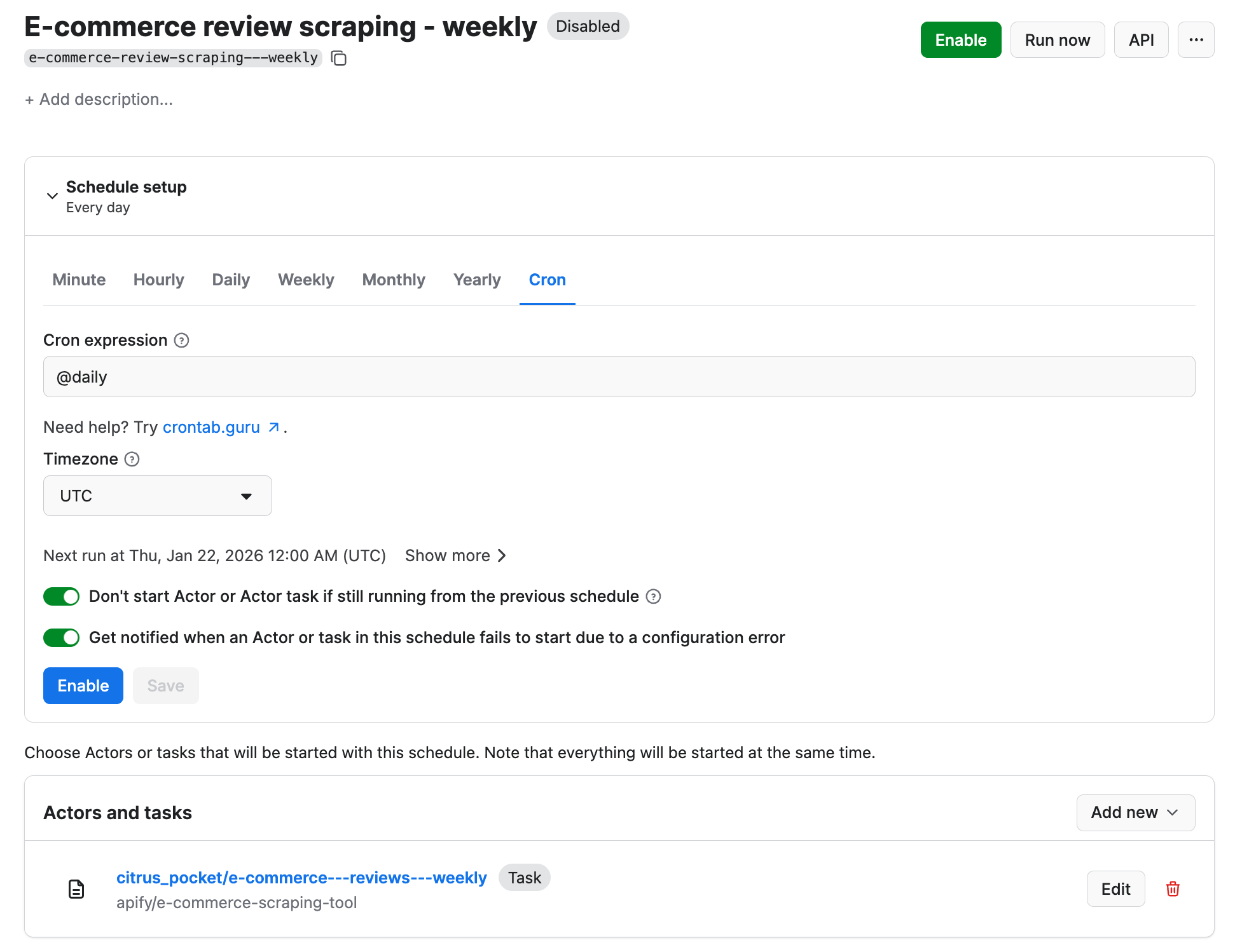 Click Enable, and your schedule will be up and running. It will automatically start the scraper at your chosen time and send the results to Google Drive, thanks to the integration we set up earlier.