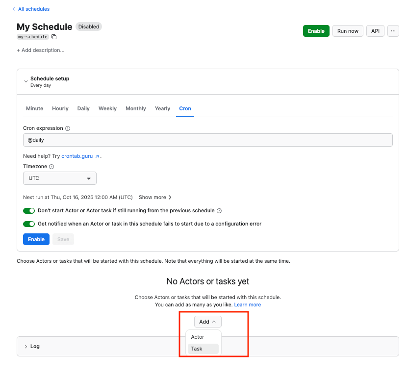 Click Enable, and your schedule will be up and running. It will automatically start the scraper at your chosen time and send the results to Google Drive, thanks to the integration we set up earlier.