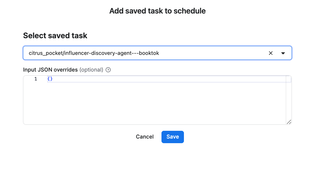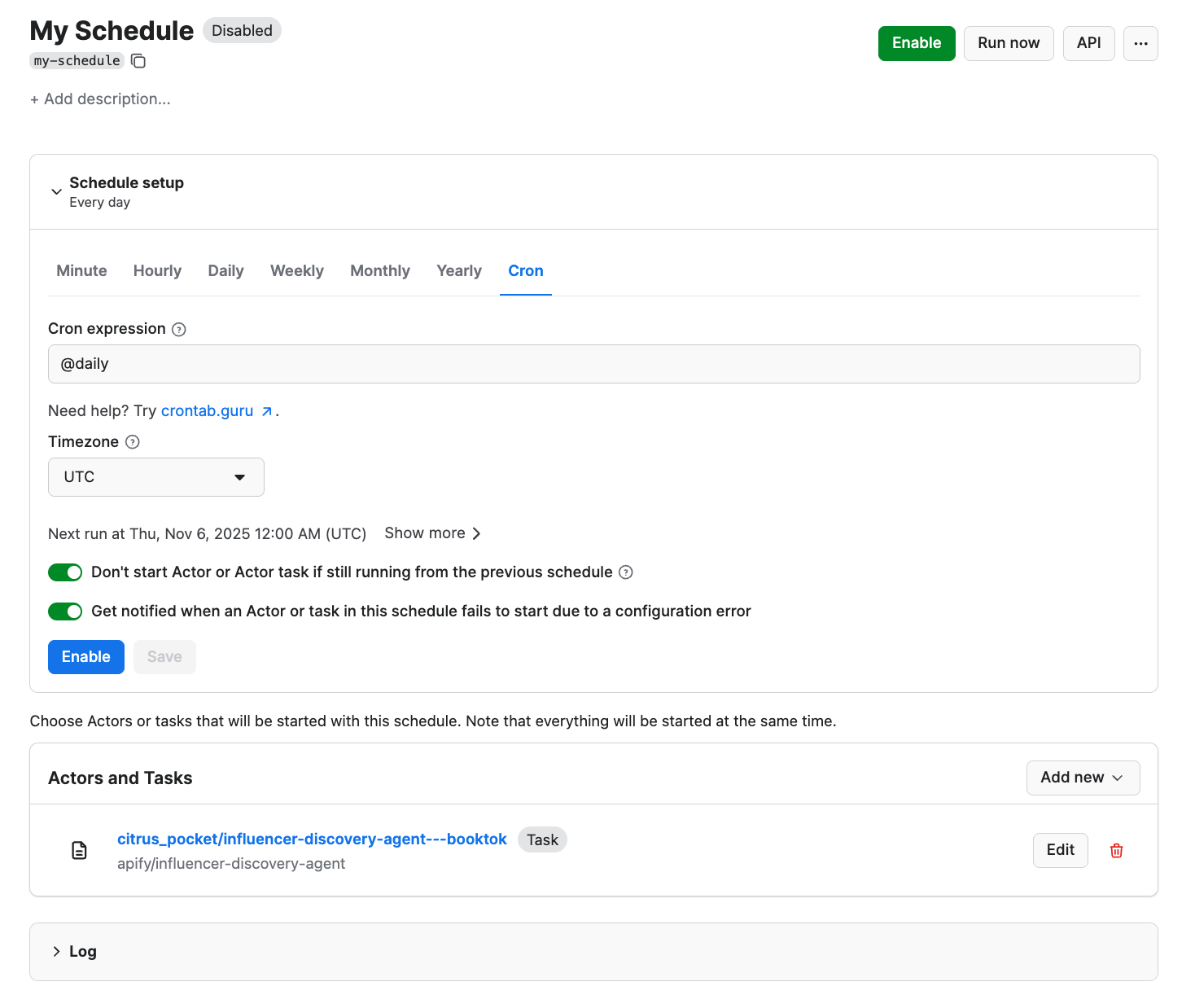 If you want to update your list of influencers regularly, you can schedule the scraper to run automatically and collect data without manual input. To do this, create a task and a schedule in Apify Console.