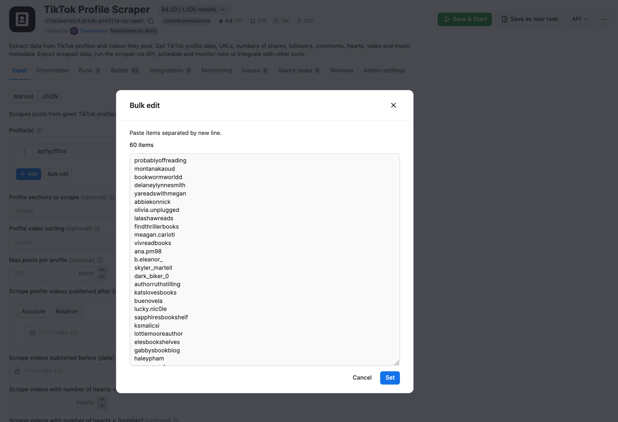 Go to your Google Sheet with influencer data and find the InfluencerMetadata/name column (in case of the Influencer Discovery Agent results) or authorMeta/name (in case of the TikTok Scraper results) column. Copy the usernames, then head back to TikTok Profile Scraper. In the Input tab, click the Bulk edit button. Paste all the user names and click Set.