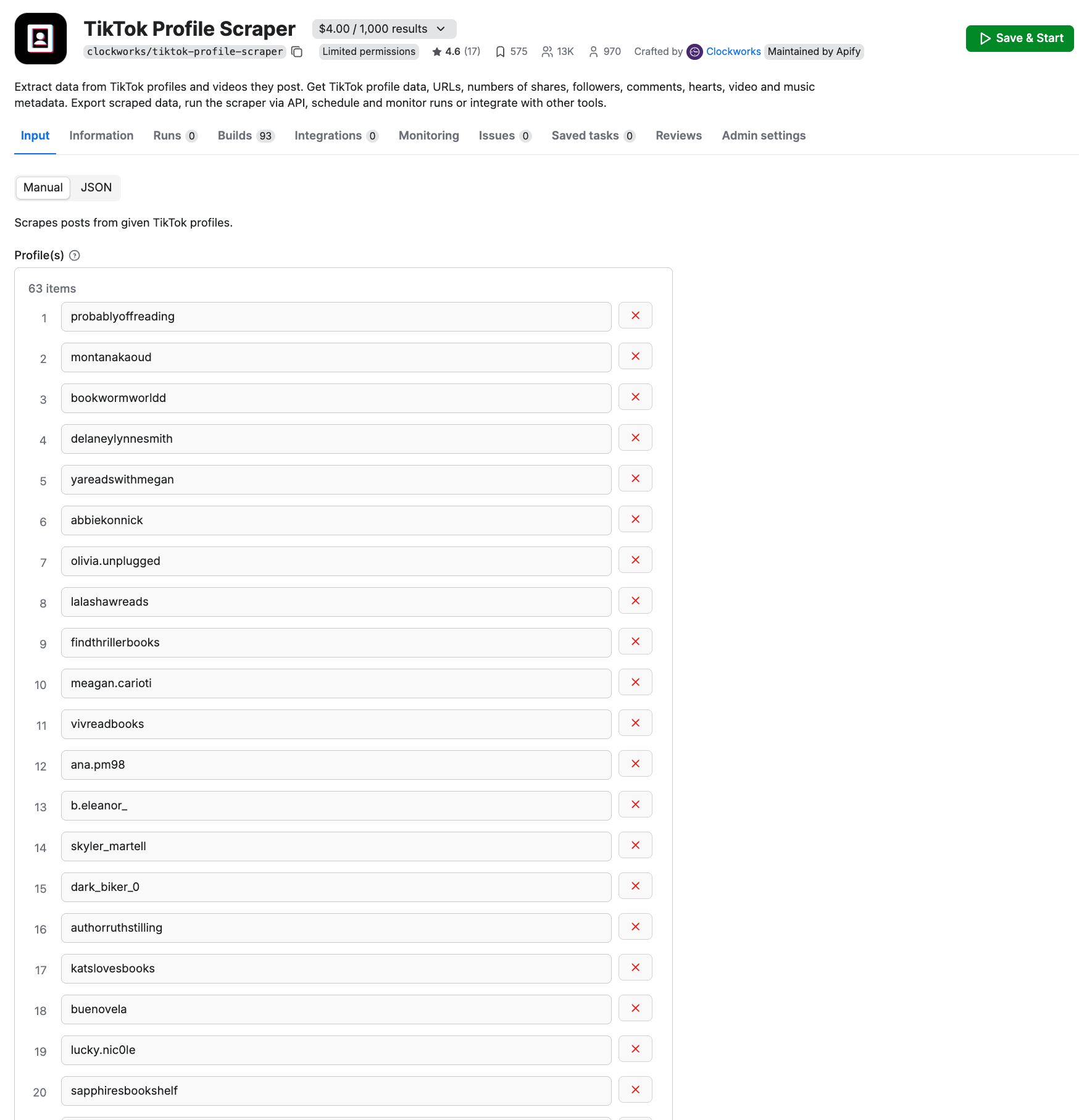 Now that you have a list of TikTok creators’ names from one or both sources, you’ll probably want to learn more about them. For that, we’ll use another Apify tool - TikTok Profile Scraper.