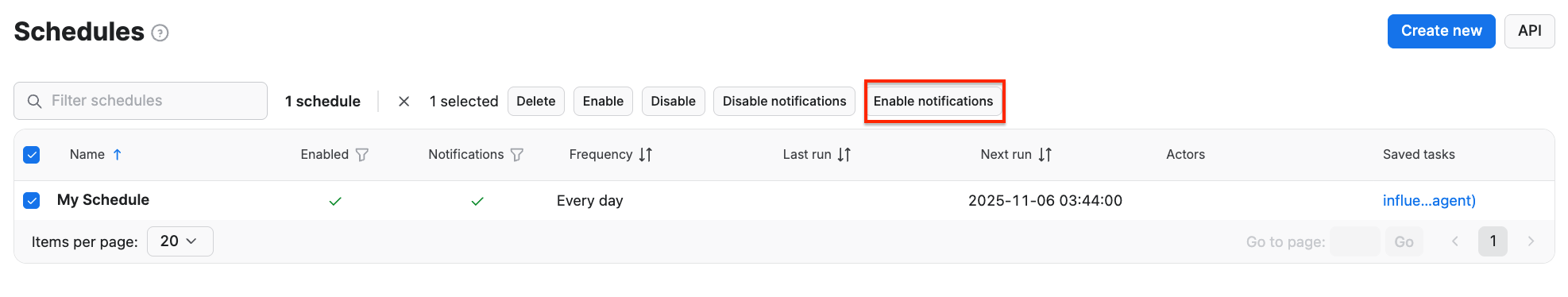 To enable notifications (and receive an email whenever the scraper runs), open your schedule in the Schedules tab and click Enable notifications. No further setup is needed.