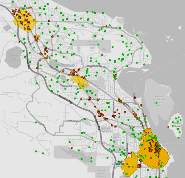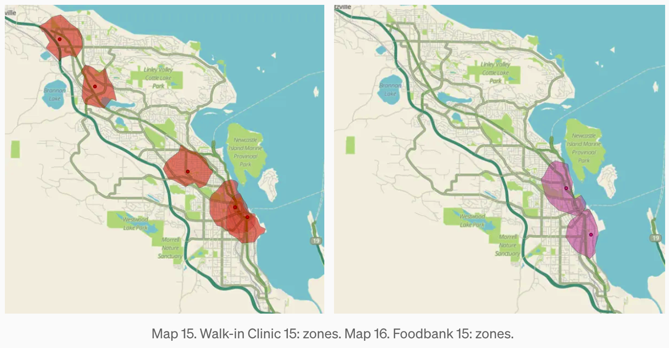 Having surveyed some of the 15-minute city literature, Robert observed two trends: there were, on the one hand, very sophisticated analyses, mostly of very large, cosmopolitan cities, and on the other, more aesthetically appealing visions of the 15-minute city with very little quantitative substance. Cities like Nanaimo generally fell outside the gaze of more cosmopolitan urban planners. Robert decided to take a very basic, broad approach that would lay the ground for an informed, local, public discussion of 15-minute walkability.