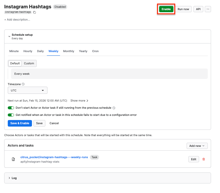 Click Enable, and your schedule will be up and running. It will automatically start the scraper at your chosen time and send the results to Google Drive, thanks to the integration we set up earlier.