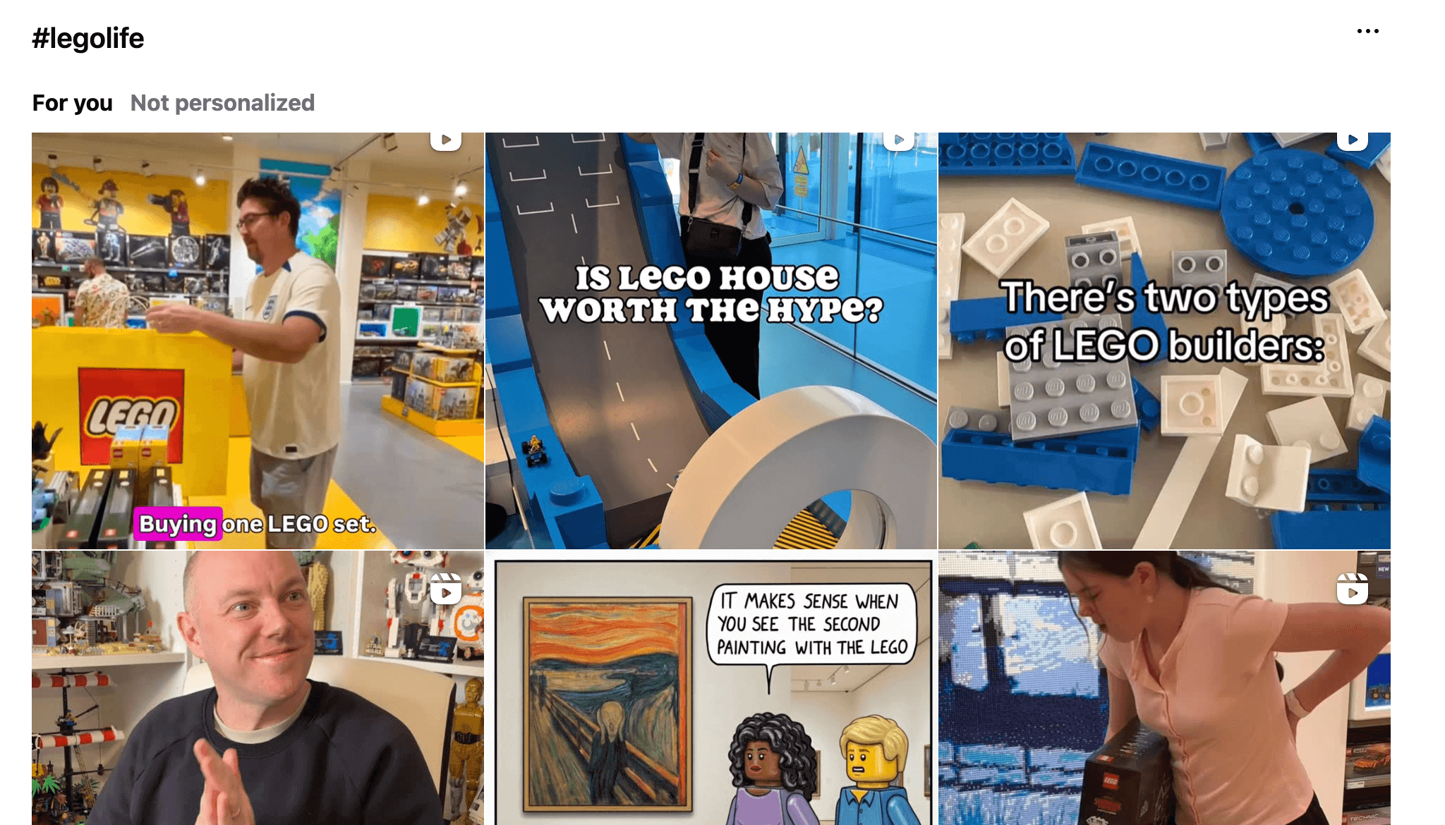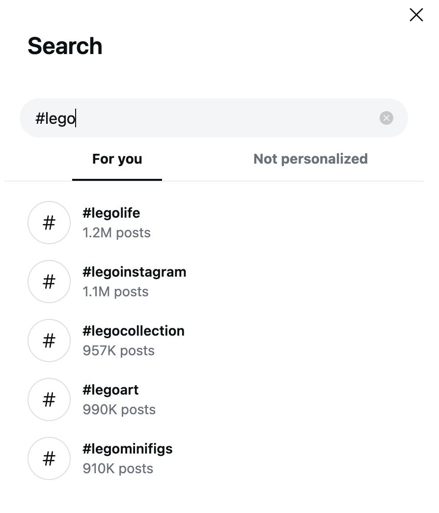 Let’s discover relevant hashtags for the popular #lego tag. With the quick Instagram search, we got several other tags we can now use as input to expand our discovery: