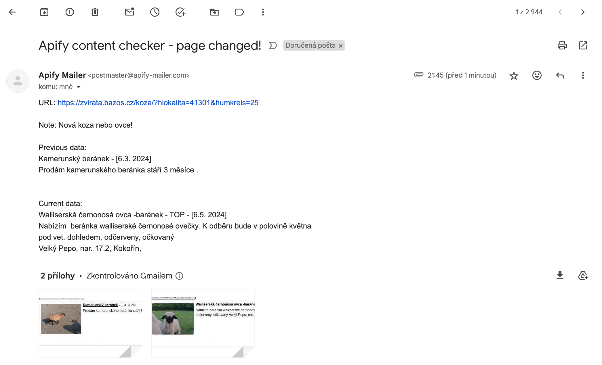 Whenever a new listing matches Zuzka's criteria, she gets an email from Content Checker