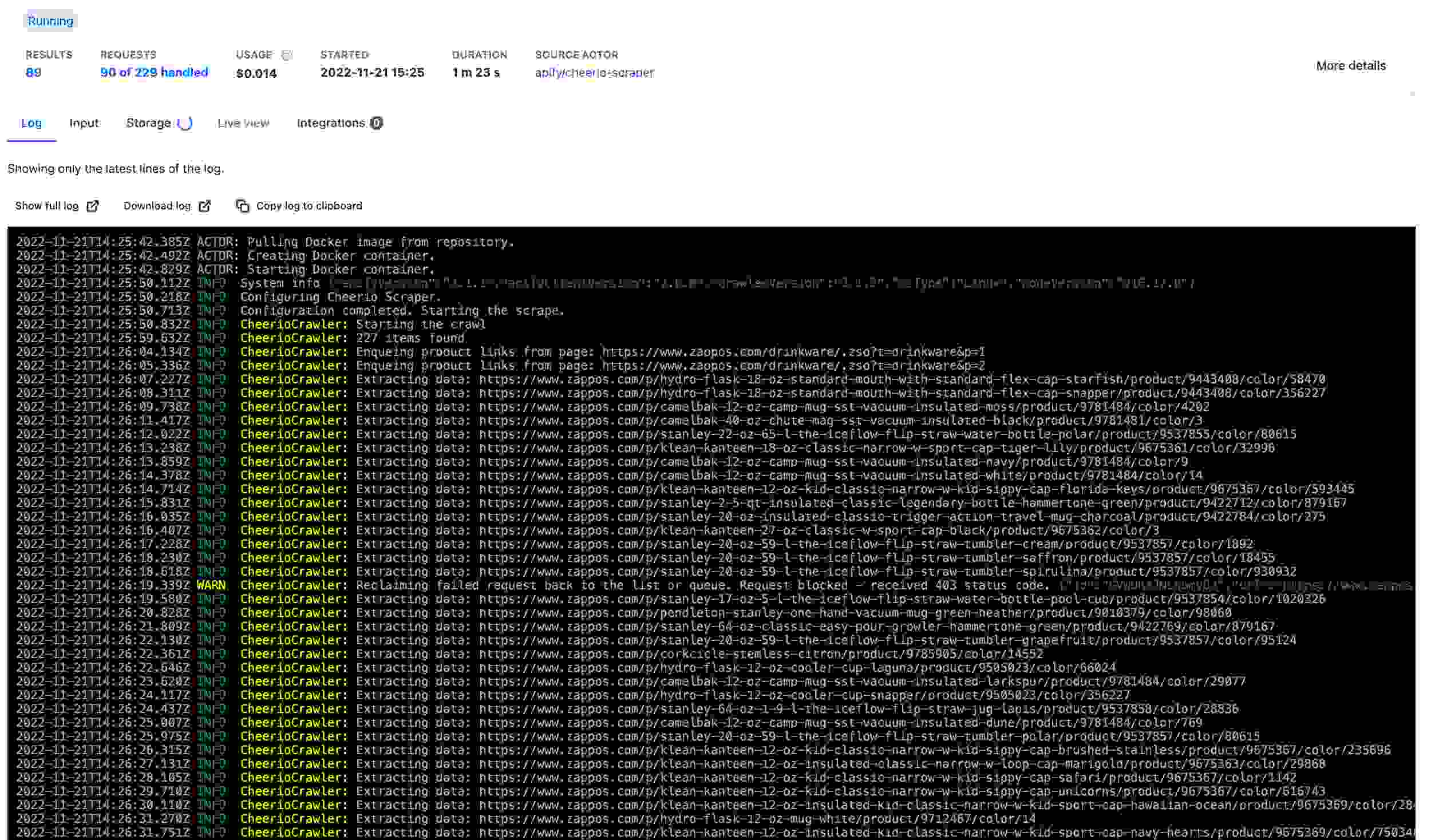 The run might take a few minutes, but thanks to the logs we added, we can follow the scraper’s activity by watching the Log tab.