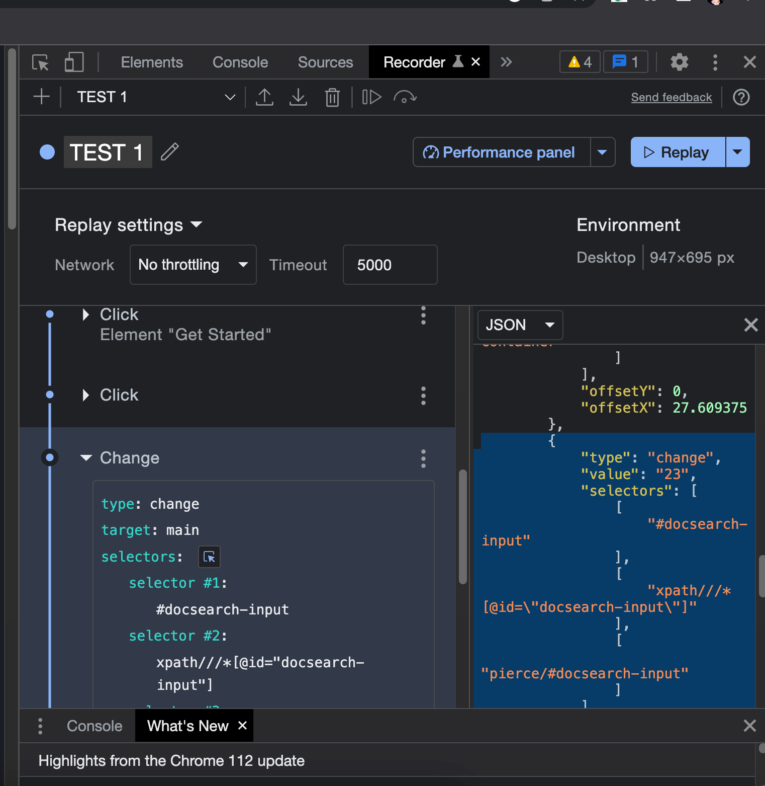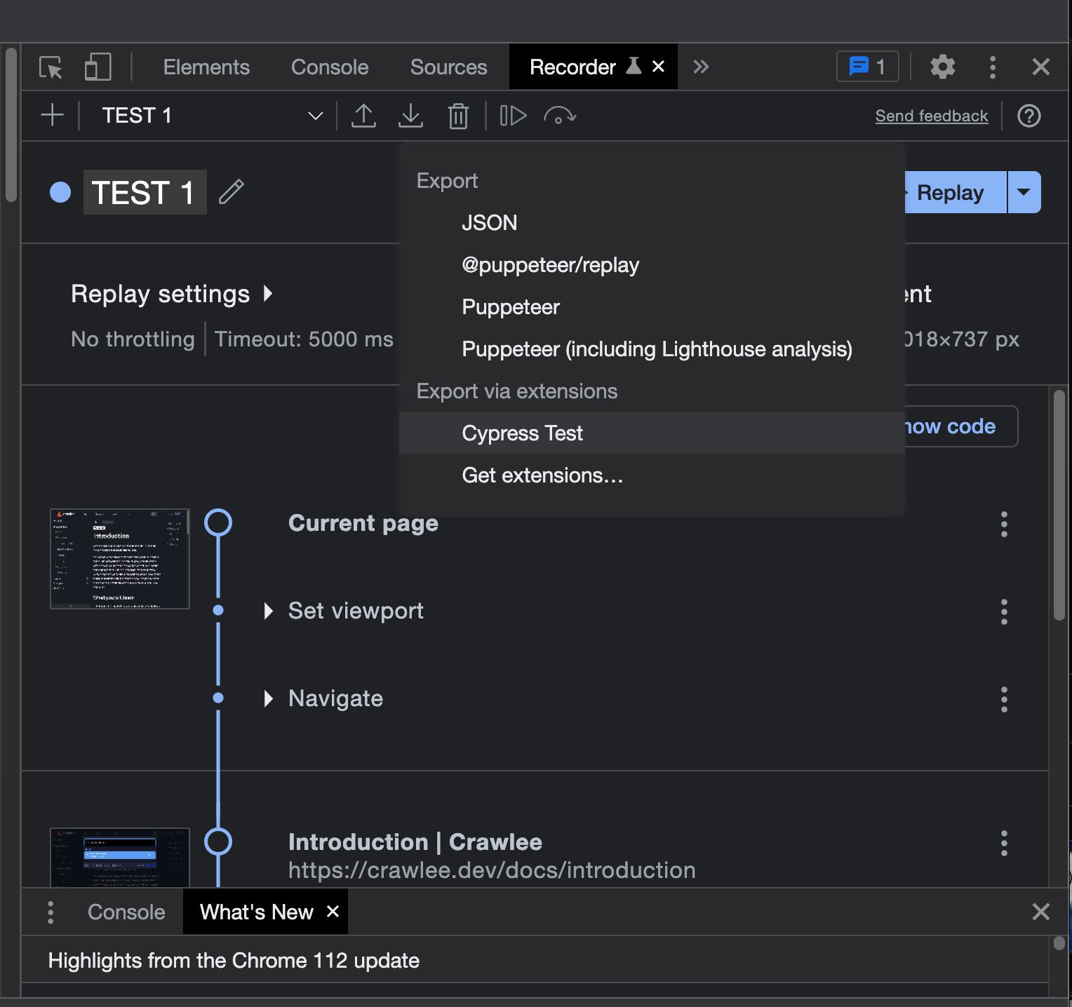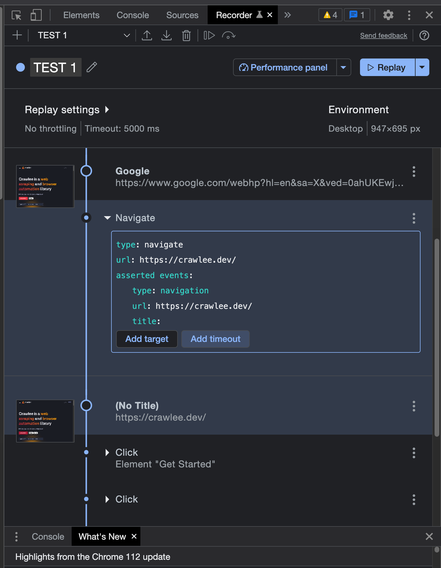 - The option to add or remove steps is very handy. The initial step always includes environment dimensions and a few device details. You can also add timeouts, events, and targets and replay the tests in Chrome as many times and as fast or slow as you need.