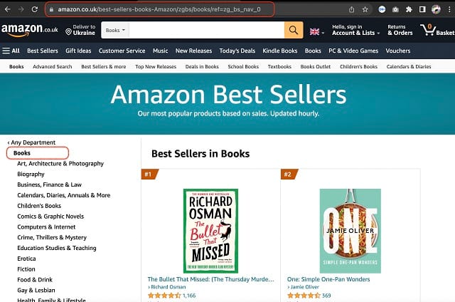 This scraper can currently extract best sellers data from 🇺🇸, 🇬🇧, 🇩🇪, 🇫🇷, 🇪🇸 and 🇮🇹 domains. Let's pick Amazon UK and scrape best-seller books from there. You will need to get a URL by going down the rabbit hole of amazon.co.uk -> Best Sellers -> Books. Now copy the result of this search - the URL at the top of the page.