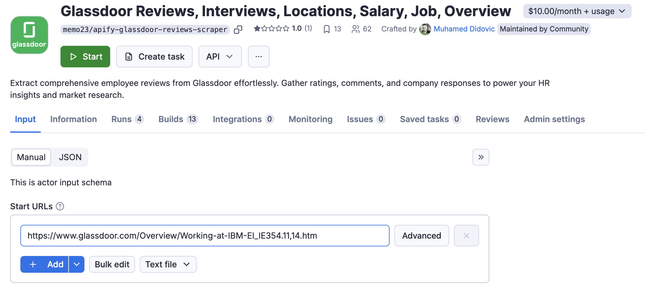To start with Glassdoor scraping, you need to find a good web scraping tool first. Visit the Glassdoor Scraper page on Apify Store and click the Try for free button. You can find other data extraction tools there that are able to scrape data from Glassdoor, but we'll be demonstrating the process on this one first.