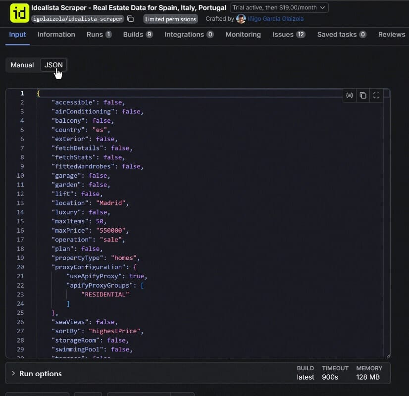 The Idealista Scraper - Real Estate Data for Spain, Italy, Portugal Actor comes with a complex configuration input.