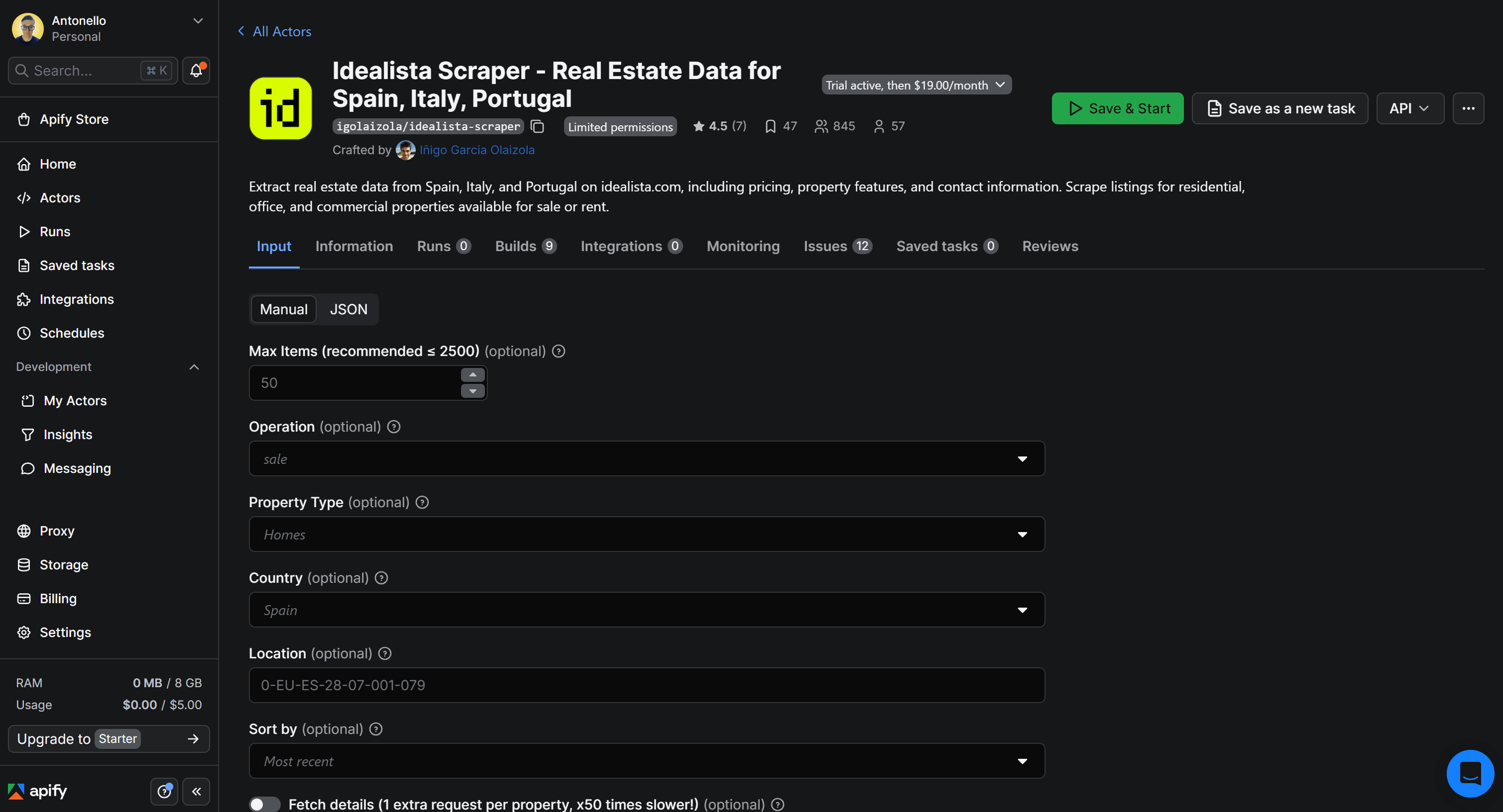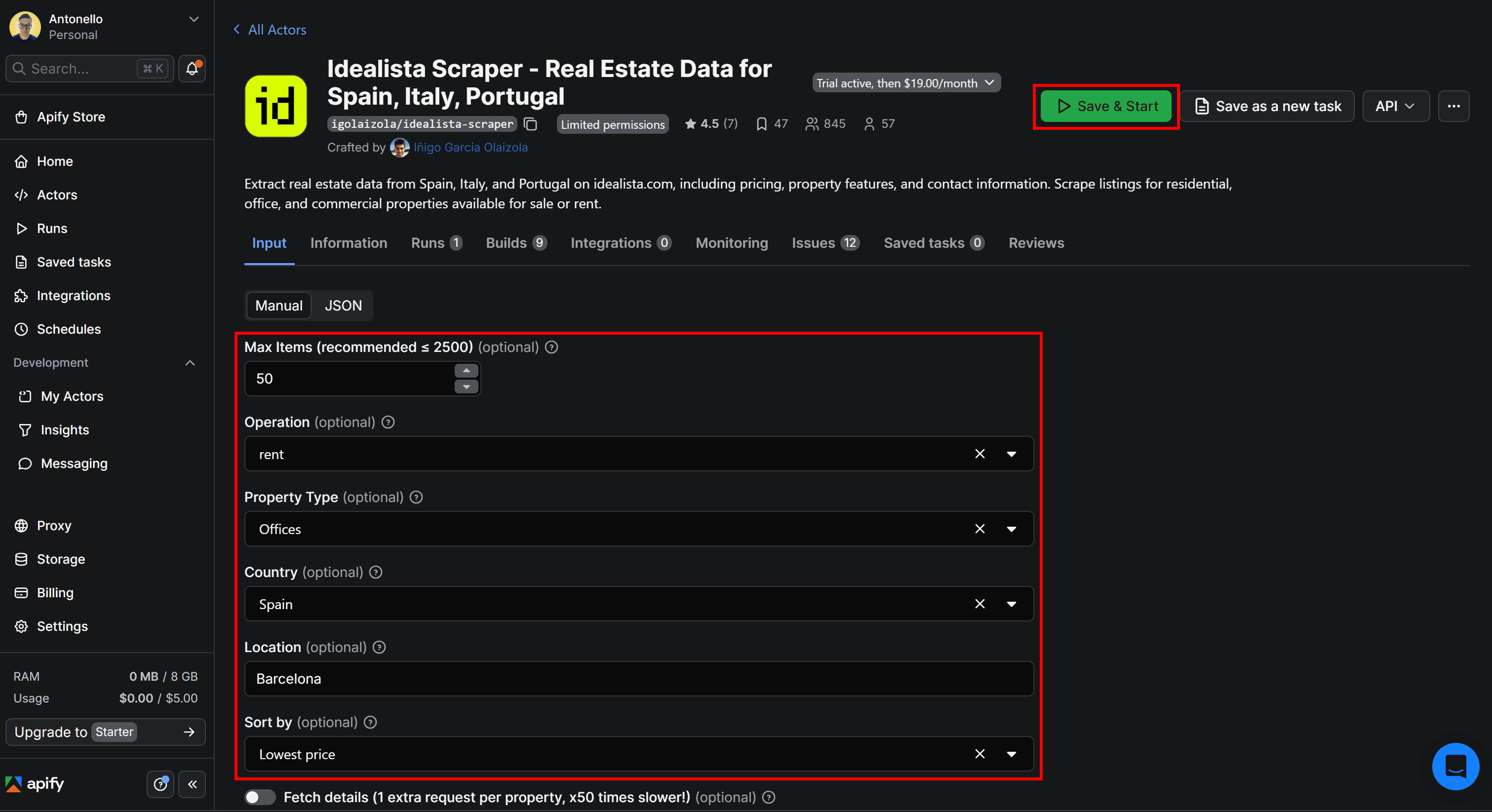 Before starting it, configure the Actor for a specific property search. For example, search for no more than 50 offices to rent in Barcelona, Spain, sorted by the lowest price. Then click Save & Start to launch the Actor: