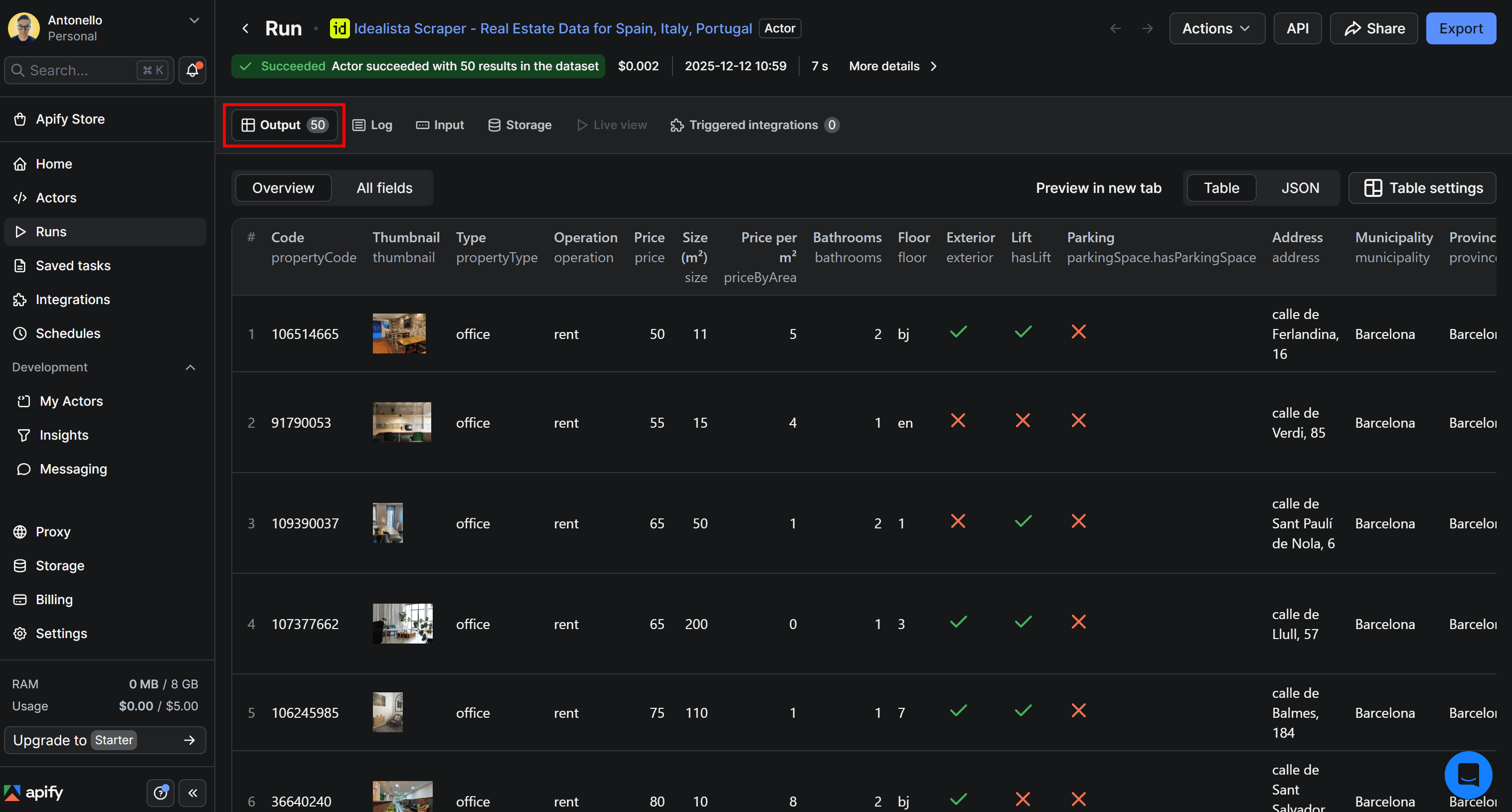 We can see that Idealista Scraper - Real Estate Data for Spain, Italy, Portugal works perfectly, retrieving property listings as intended. This no-code approach makes accessing idealista real estate data simple, even for non-technical users.