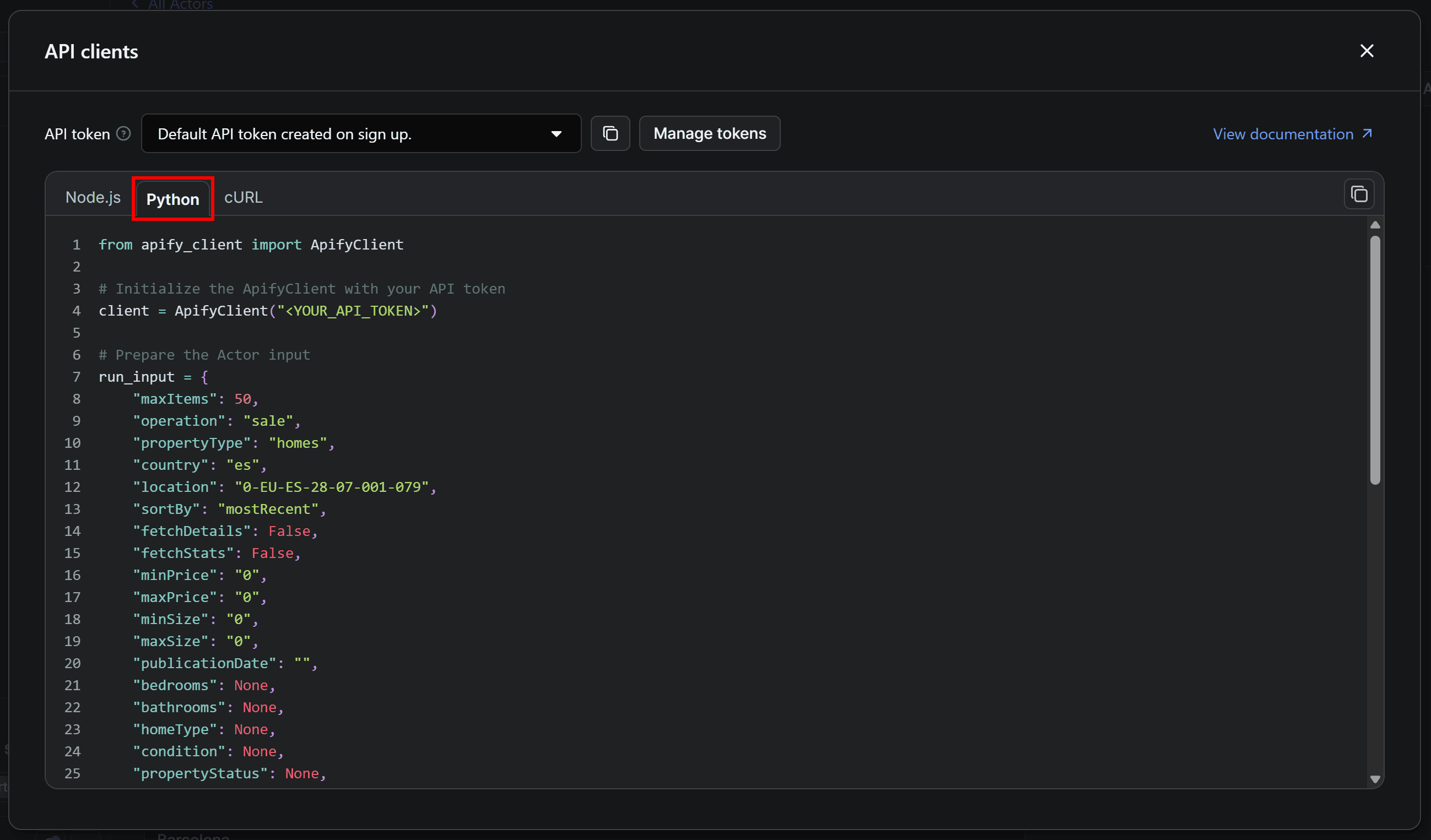 In the Python snippet you copied earlier, you’ll also see a placeholder for your Apify API token. That’s required to authenticate requests made by the Apify API client to the configured Actor in your account.