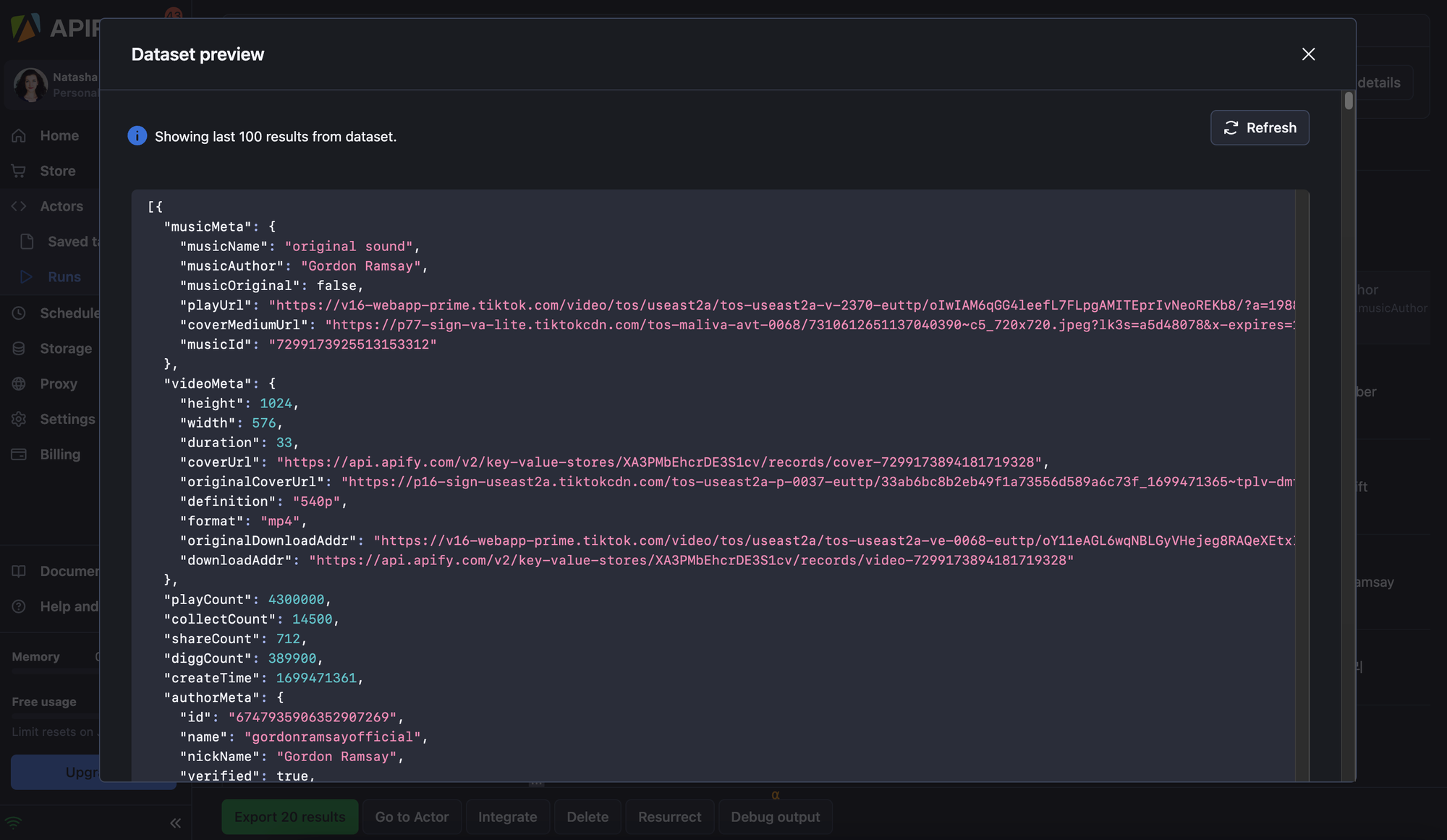 These TikTok scrapers are among the Actors available on Apify Store. You can use them via API or scheduler. Consider them your own personal TikTok API. You can call them using an API Client in Python, JavaScript, and cURL. You can also use available API endpoints to get the scraped TikTok data to where you need it.