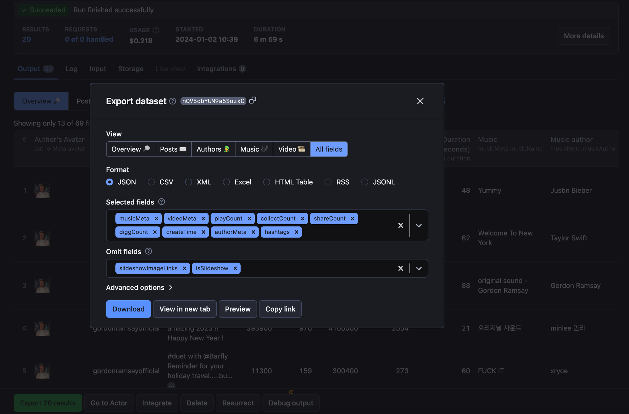 After the run has finished, you can preview the scraped data in the output table or in a new tab. You can choose the format before downloading the dataset.