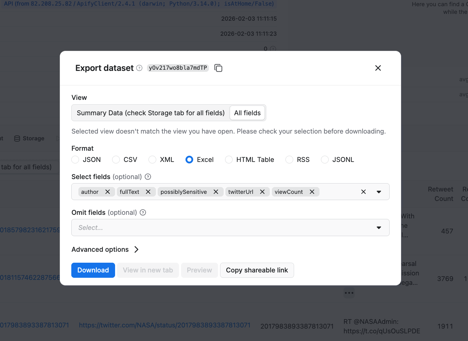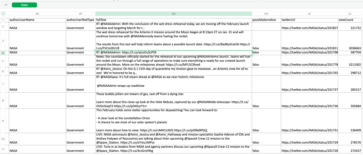 Now that the code is set up to scrape data from a specific Twitter handle, we can run it to trigger the API call.