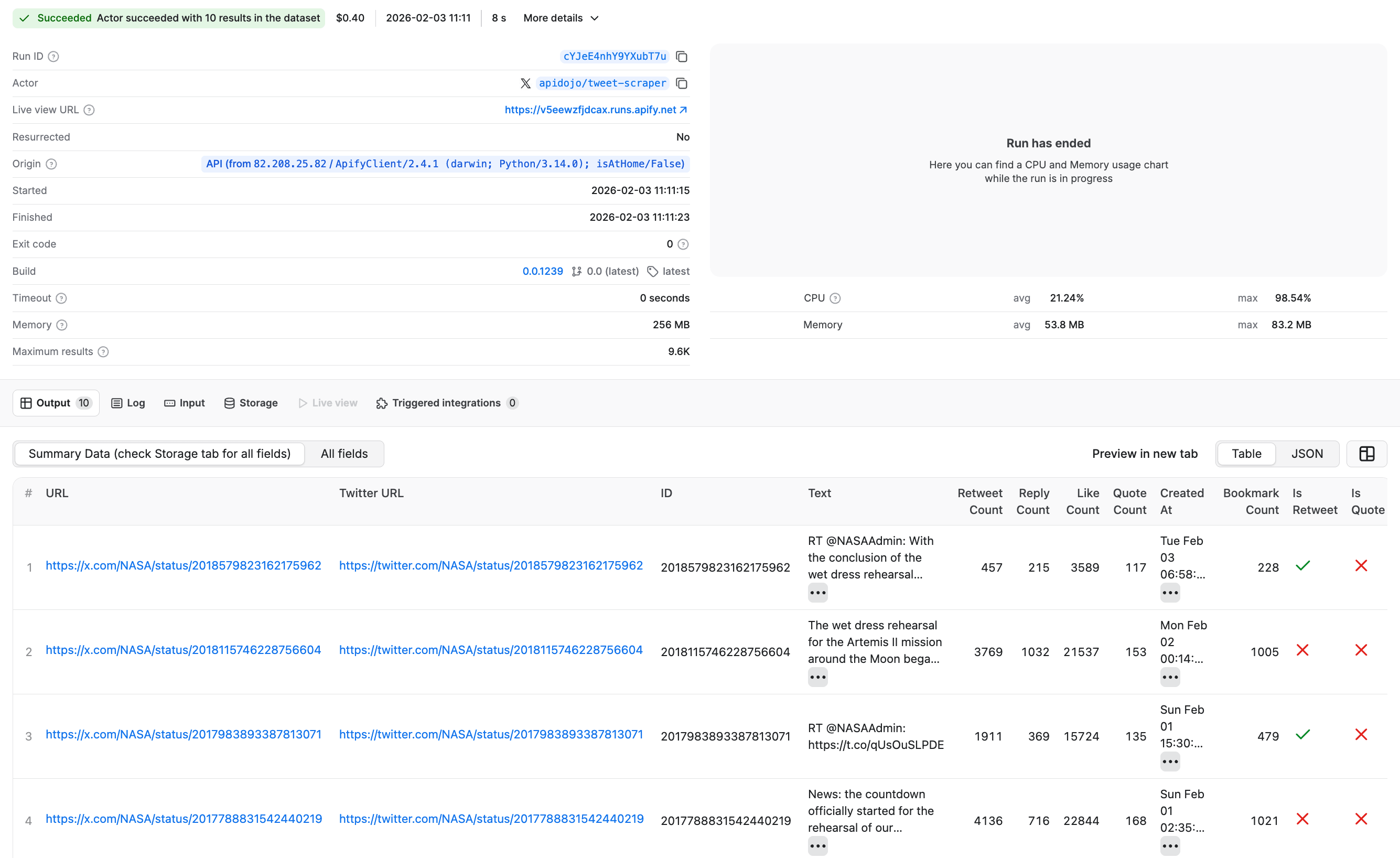 As you can see, the NASA profile name appears in the twitterHandles field. Now, follow this structure and populate the input dictionary in Python, and call Tweet Scraper V2 - X / Twitter Scraper as shown below:
