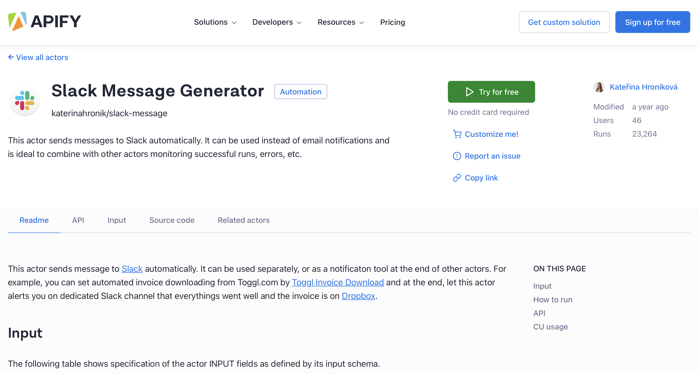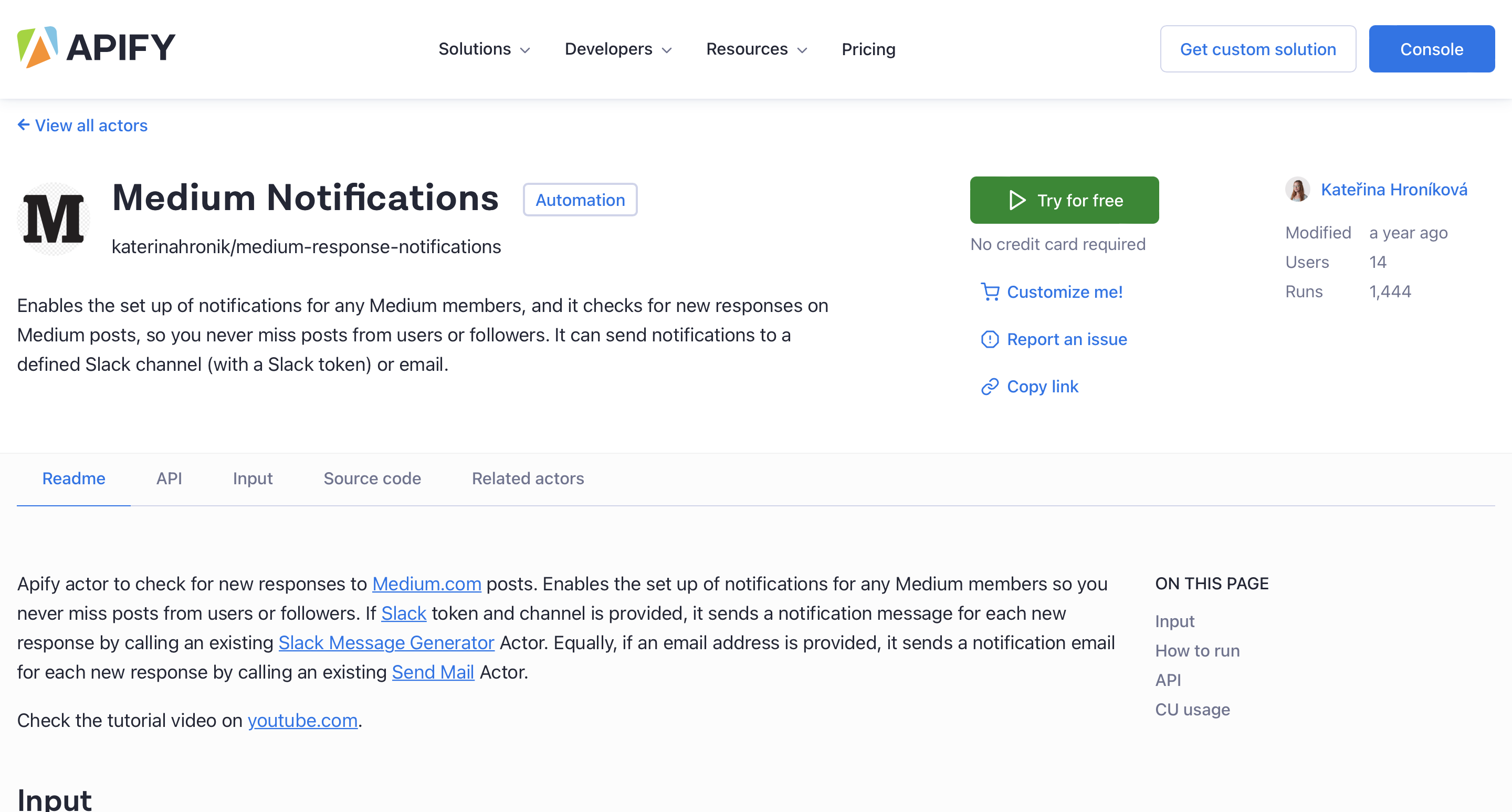 1. First, go to the Actor's page and click the Try for free button. You will be redirected to Apify Console, which is your workspace to run tasks for your scrapers. If you already have an Apify account and are logged in, go to Step 3.