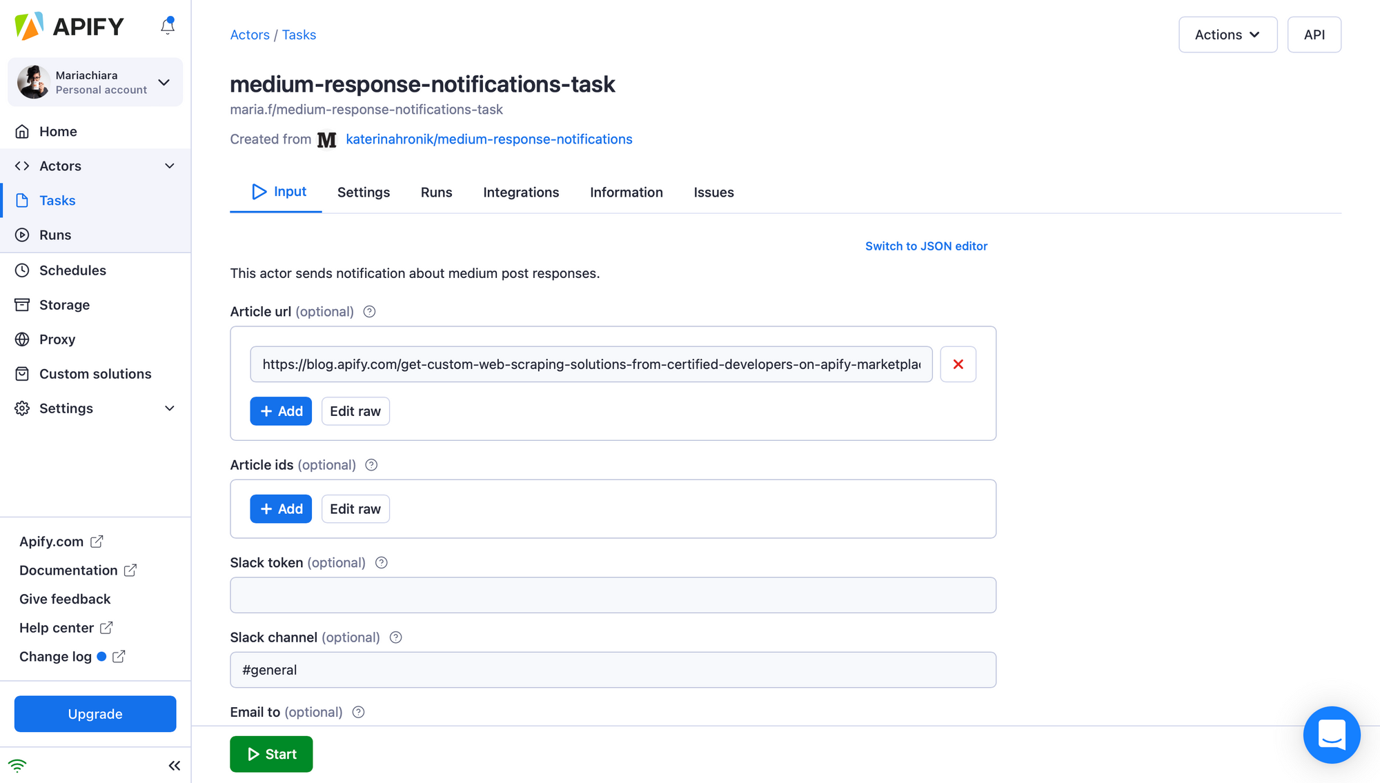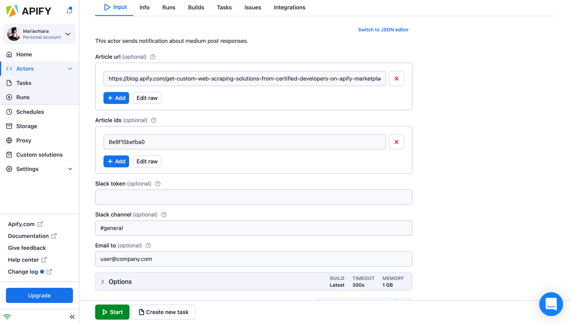 4. Now you can fill in the input fields. In the Input section, add all the URLs or article IDs (the alphanumeric part at the end of the article’s URL, e.g. 8e9f15befba0) of the Medium blog posts you want to track. Remember to also add your email address. Once you are done setting up your search, click the Start button.