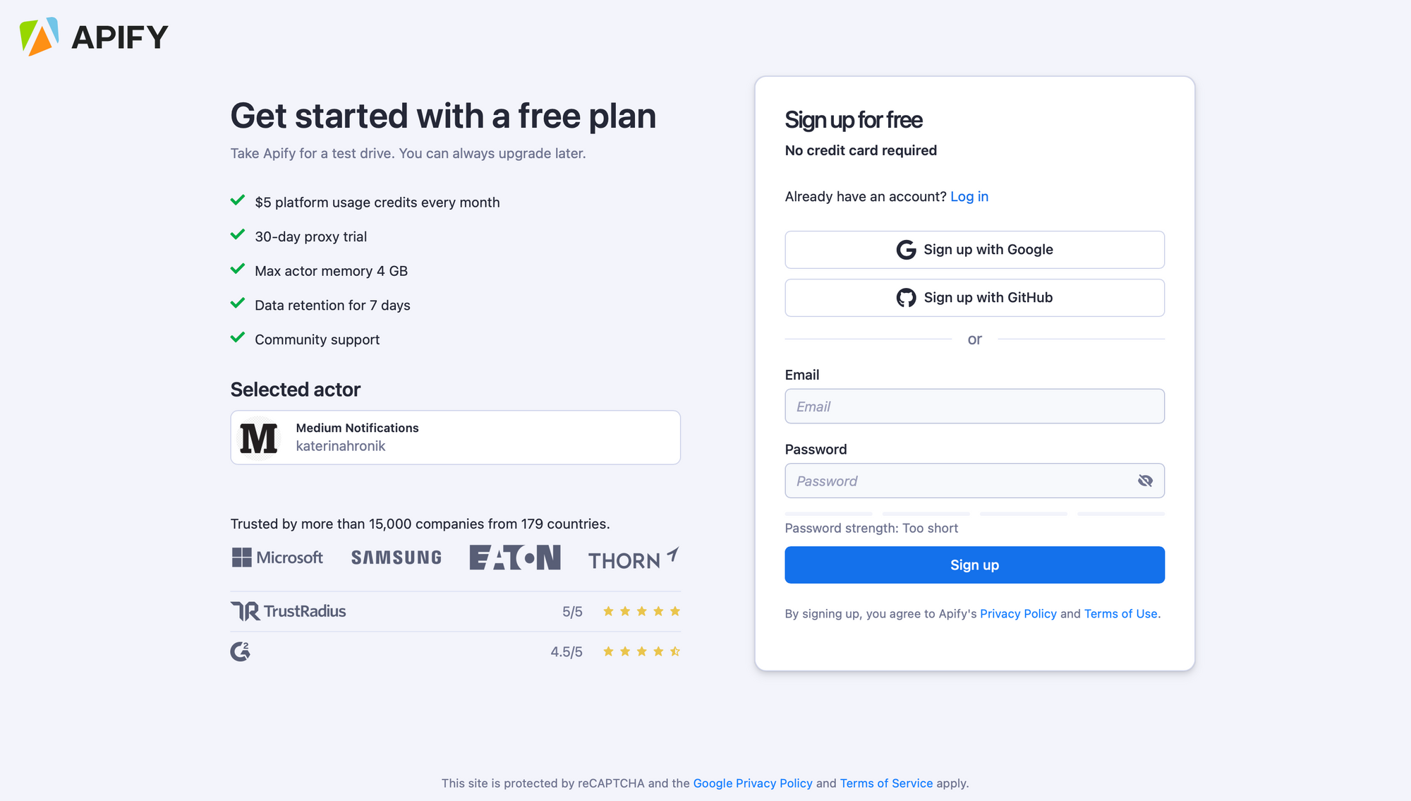 2. If you are not signed in, you’ll find yourself on the sign-up page (if you are already signed in, skip to Step 3). Sign up using your email account, Google, or GitHub. You will be redirected to the scraper’s page on your Apify Console.