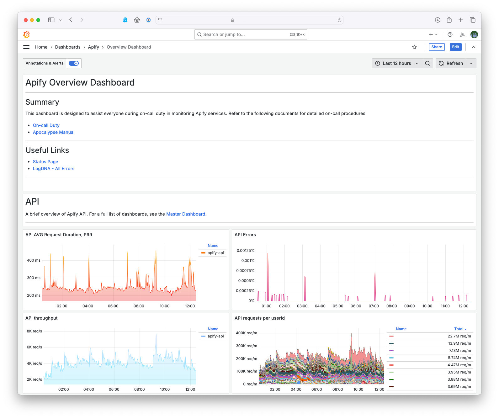 In addition to many pre-made dashboards, focused especially on AWS and Kubernetes, developers have created more than 80 dashboards that provide different and customized views of Apify platform components. There are also more than 100 alerts that inform about any anomalous platform behavior.