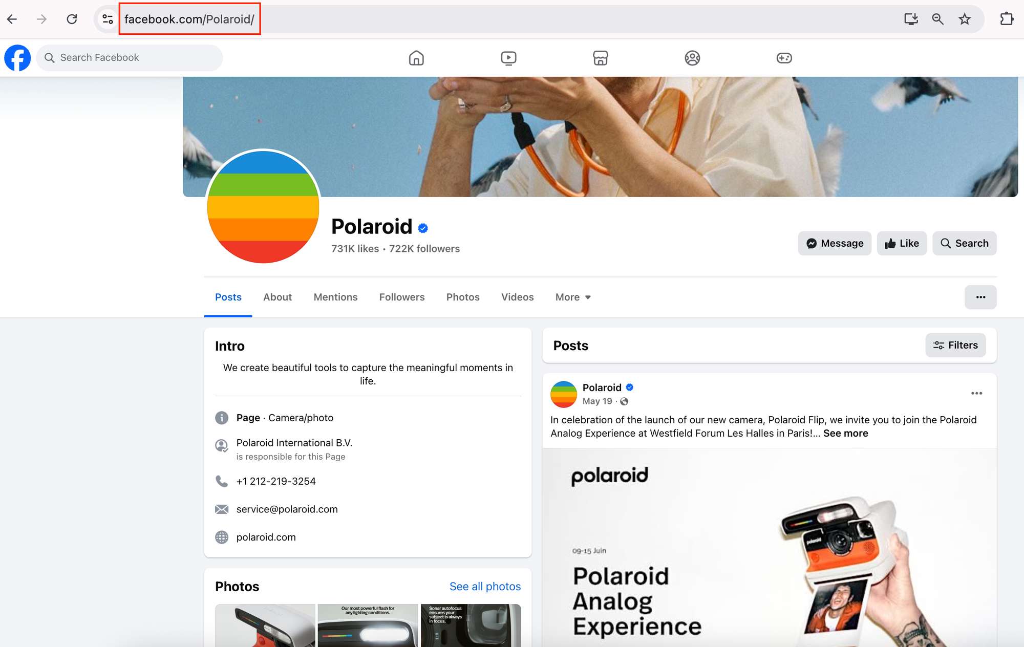 Head over to facebook.com, find the Facebook page of the brand or public figure whose ads you’re interested in, and copy their page URL(s). This method is the easiest since you don’t have to search for the ads themselves; a page is all you need. For our example, we’ll use Polaroid’s Facebook Page.