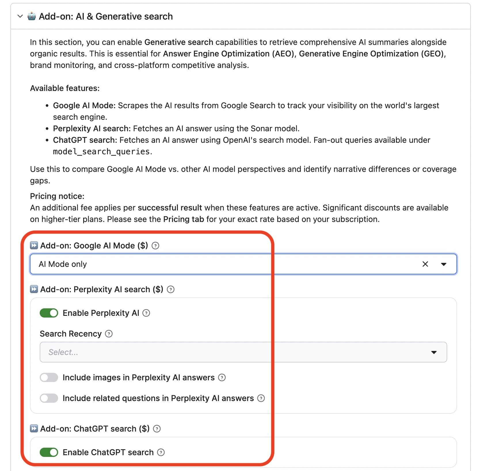 enableAiMode: Captures AI-generated overviews powered by Gemini that appear at the top of Google Search results. Returns structured data including the overview text, cited sources, and related questions.enableChatGpt: Queries ChatGPT's search interface and returns AI-synthesized answers with source citations. Includes "query fan-out" data showing additional queries the model generated internally.enablePerplexity: Uses Perplexity's Sonar model to generate research-focused answers with academic-style citations and source credibility indicators.