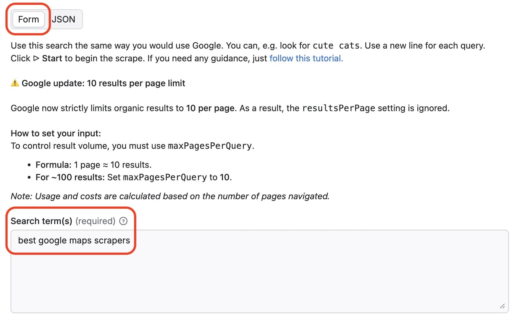 Now fill in the input fields. You can configure the input using the form or JSON. Provide keywords in the search terms field. We’ll use best Google Maps scrapers as our search term.