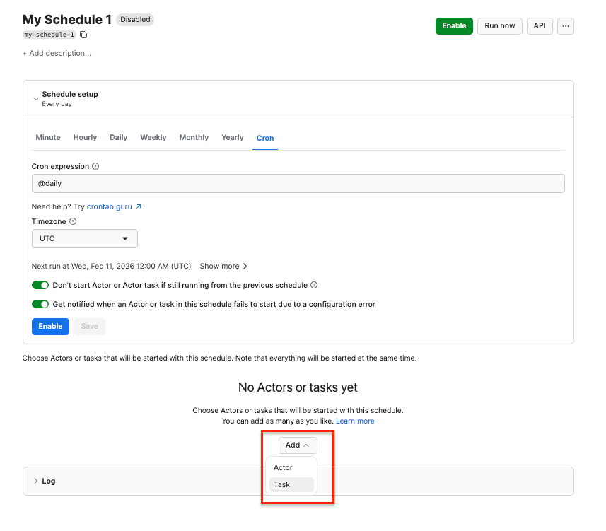 Click Enable, and your schedule will be up and running. It will automatically start the scraper at your chosen time and send the results to Google Drive, thanks to the integration we set up earlier.