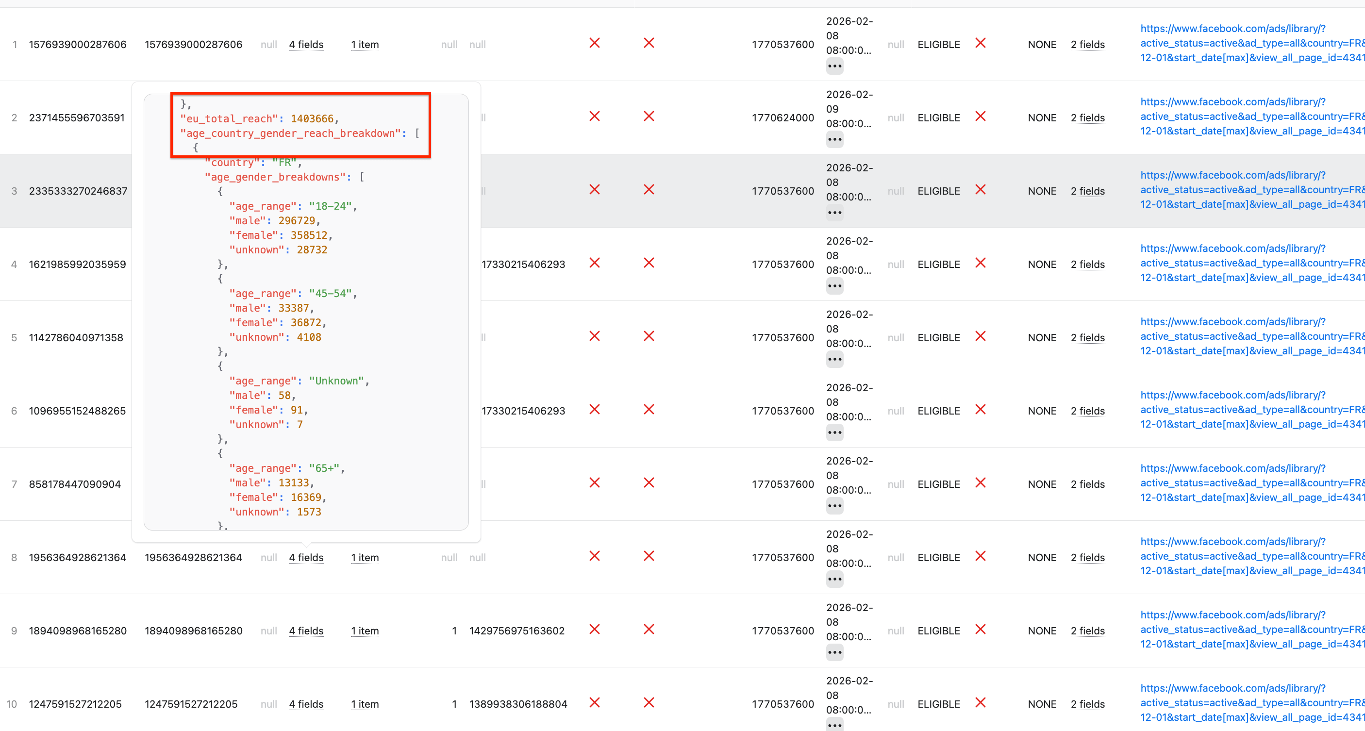 - Meta’s official API: Sounds promising until you discover it doesn't provide competitor ad data, creative changes, or historical coverage in a usable format. The API is primarily designed for political and social-issue ads, and for regulatory compliance in the EU and UK.