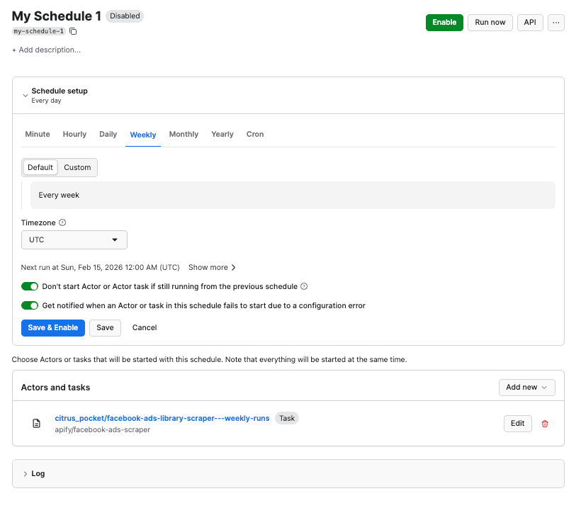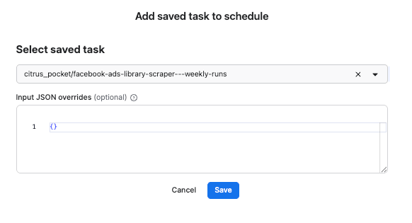 If you want to scrape ads regularly, you can schedule each scraper to run automatically and collect data without manual input.