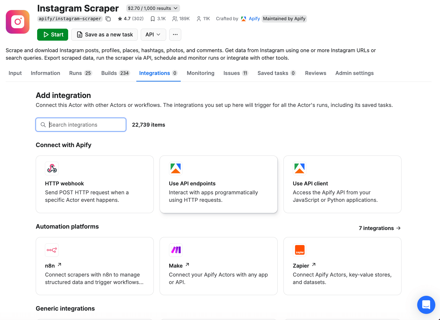 This Instagram Scraper is one of many Actors available in Apify Store. As with the other Actors, you can use this scraper directly on the platform with a few clicks, or using an API or scheduler. So basically, you can consider it your own personal Instagram API. You can call this Instagram web scraper using an API Client in Python, JavaScript, and curl. You can also use available API Endpoints to get the scraped Instagram data to where you need it.