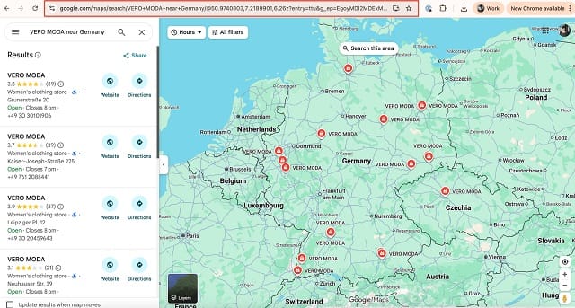 Let’s say we’re interested in reviews from the brand’s retail stores located in Germany - we’ll search for the Vero Moda stores on Google Maps directly, and then copy the URL to use as input for Google Maps Reviews Scraper: