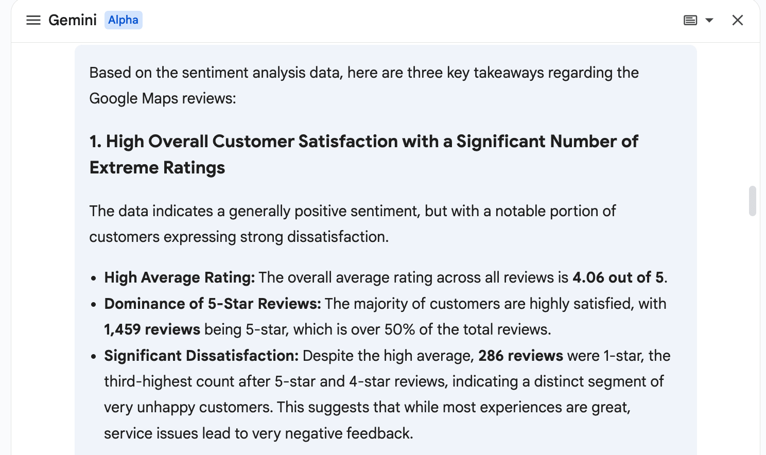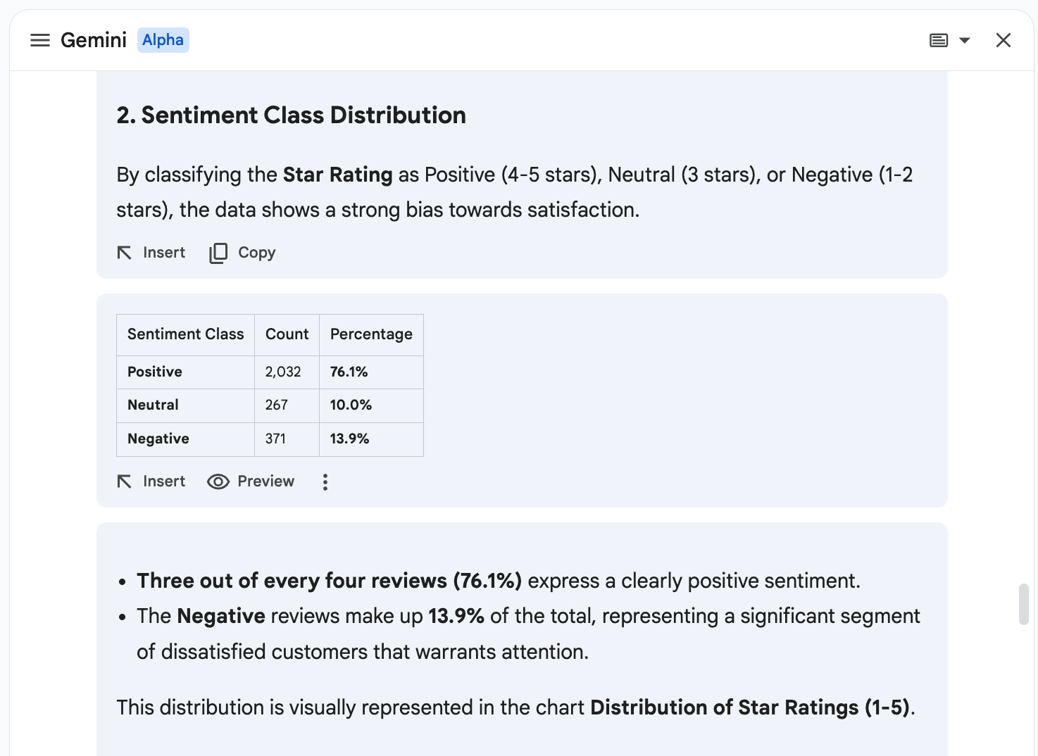 Now you can interact with Gemini inside your spreadsheet. With a simple prompt (we’ve used Perform sentiment analysis as an example), Gemini can provide you with a detailed analysis, including charts, average ratings, and more.