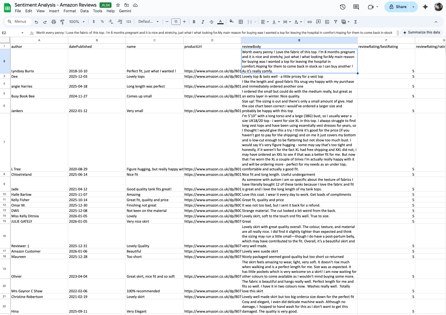 Your Excel spreadsheet includes all the details, including the review text, URL, whether the review was verified or not, and even the response from the customer operations team.