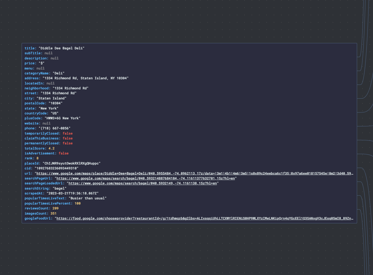 You should only scrape personal data if you have a legitimate reason to do so, and you should also factor in Google's Terms of Use. We are aware of that and built our Google Reviews Scraper in a way to be able to avoid extracting personal data. You can read the basics of ethical web scraping in our expert piece on the legality of web scraping.