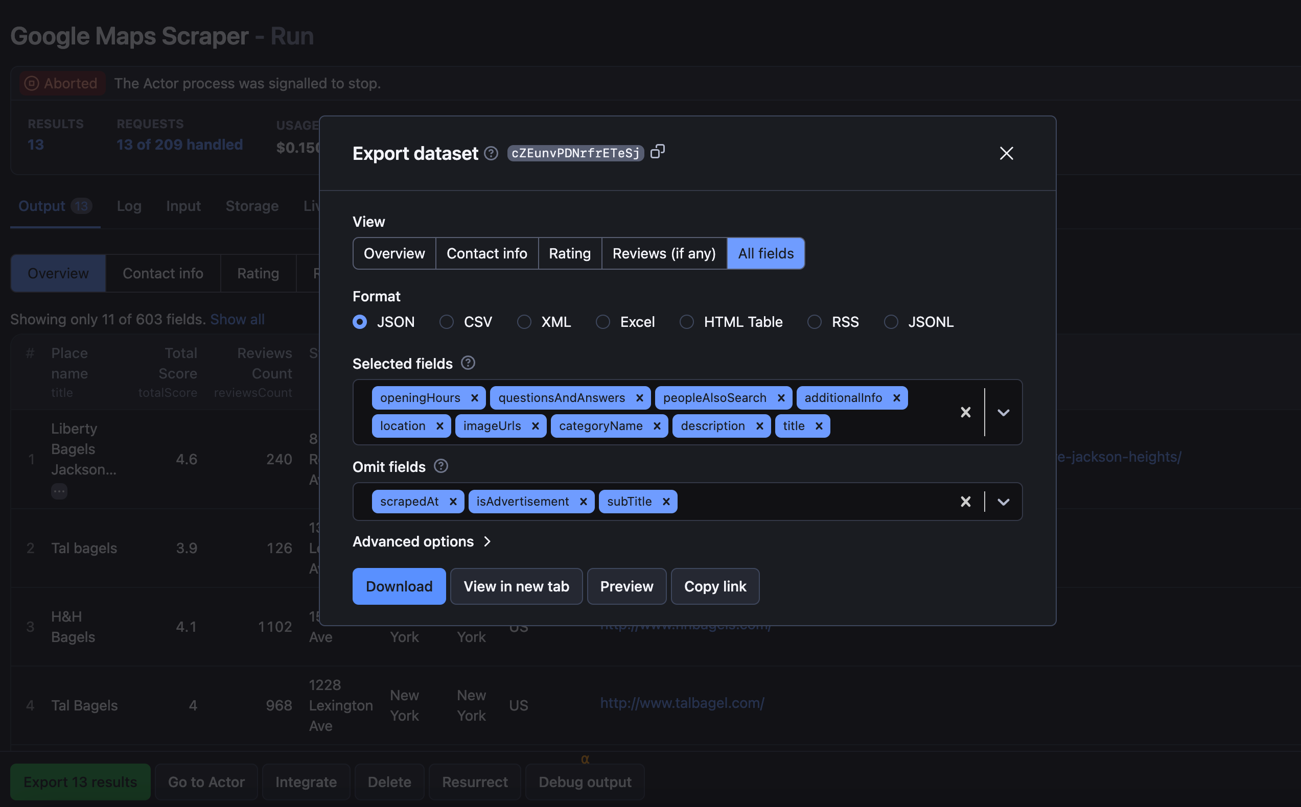 To preview and download the dataset, move over to the Storage tab or click on the Export button. It will contain your scraped data in various formats, including HTML table, JSON, CSV, Excel, XML, and RSS feed. Besides the format, you can also choose which part of the dataset you want to download: all data, rating, contact info or reviews, or even which specific fields to keep or get rid of.