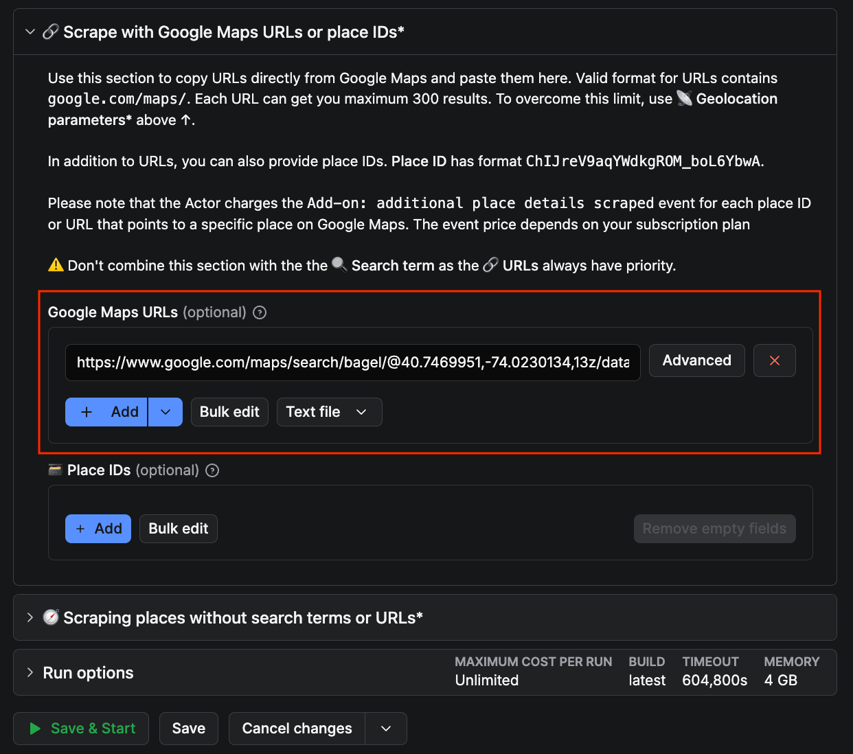With this option, you can also adjust the zoom level of the area to scrape, before you copy-paste the URL. If you zoom in, you will get more detailed results, including smaller businesses. Otherwise, you will obtain what Google Maps will consider the most relevant places over a larger area. You can read more about scraping Google Maps by URL here.