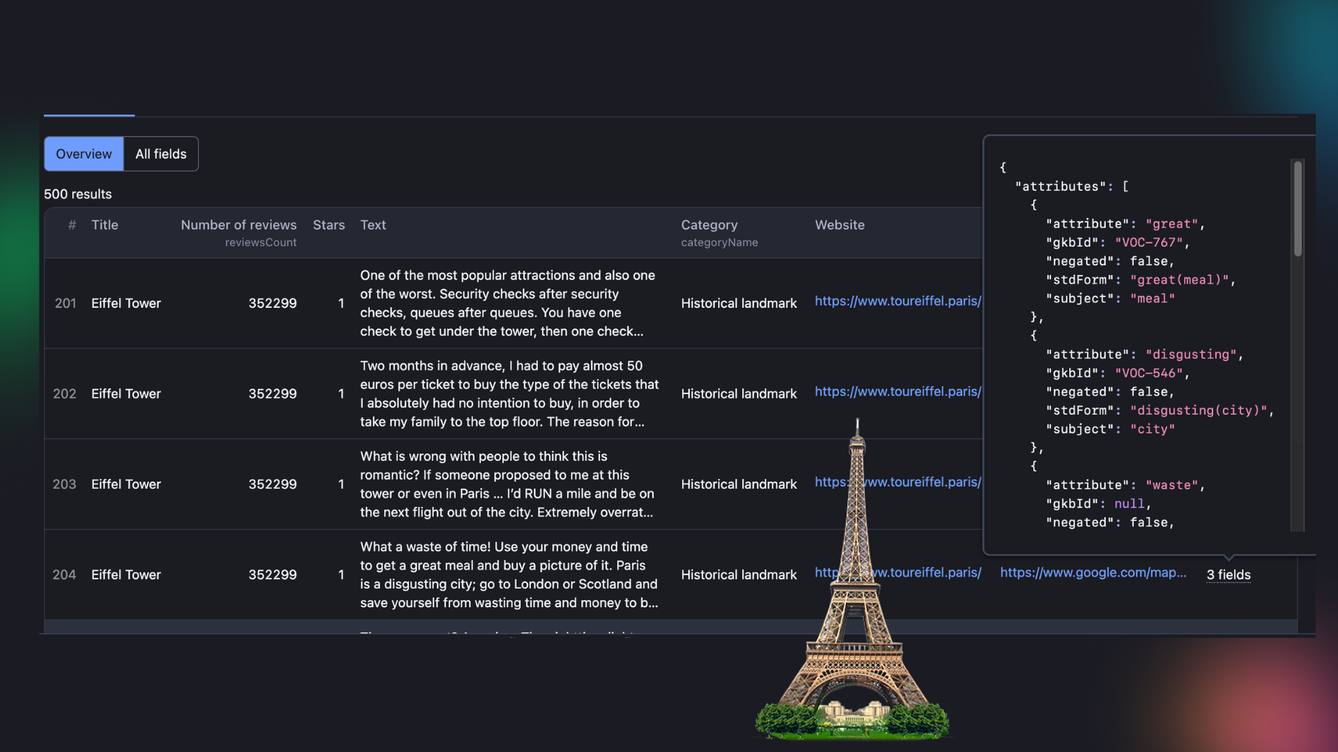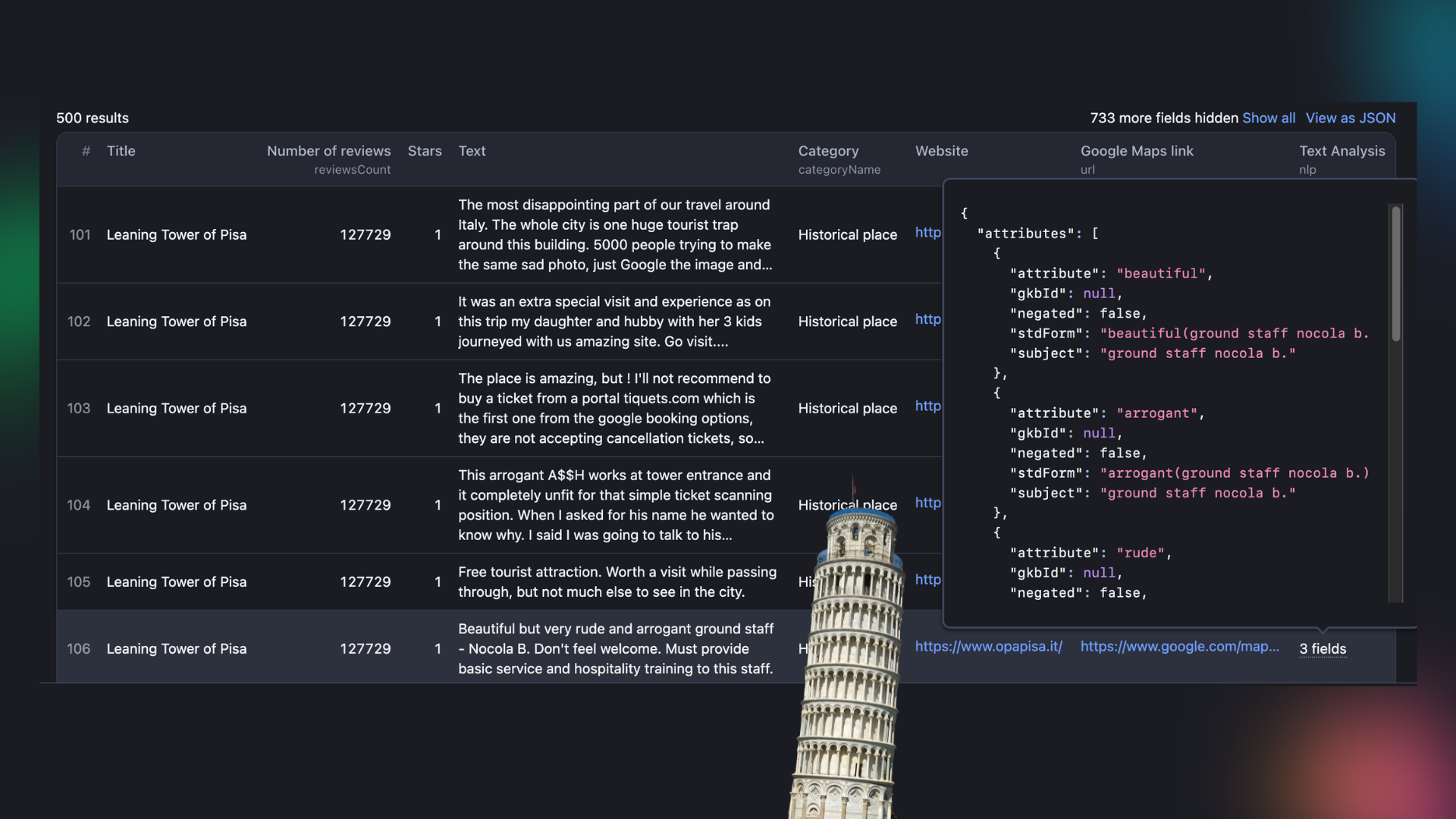 So is it worth going to see the Tower of Pisa? Or waiting in queues to see Paris from a bird’s view? We don’t know. This review analyzer only checked for bad reviews 🤷🏻♀️. To be fair to a popular tourist attraction, we’d need to analyze the whole scope of the reviews: the good, the bad, and the meh ones.