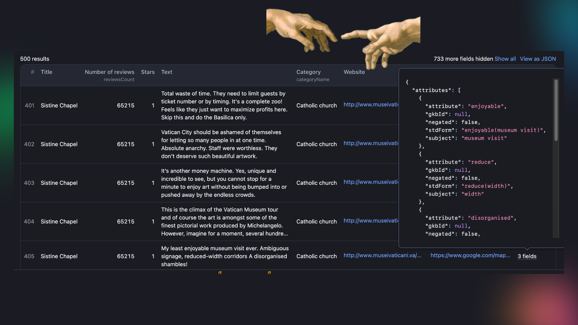 In just one minute, we have all 500 very candid reviews in one neat dataset, starting with the first batch of good-old Stonehenge bashing.